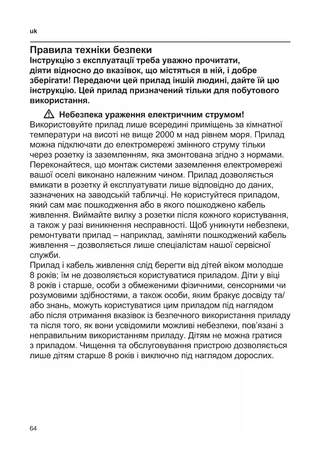 Прилад і кабель живлення слід берегти від дітей віком молодше 8 років; їм не дозволяється користуватися приладом. Діти у віці 8 років і старше, особи з обмеженими фізичними, сенсорними чи розумовими здібностями, а також особи, яким бракує досвіду та/ або знань, можуть користуватися цим приладом під наглядом або після отримання вказівок із безпечного використання приладу та після того, як вони усвідомили можливі небезпеки, пов’язані з неправильним використанням приладу. Дітям не можна гратися з приладом. Чищення та обслуговування пристрою дозволяється лише дітям старше 8 років і виключно під наглядом дорослих.65