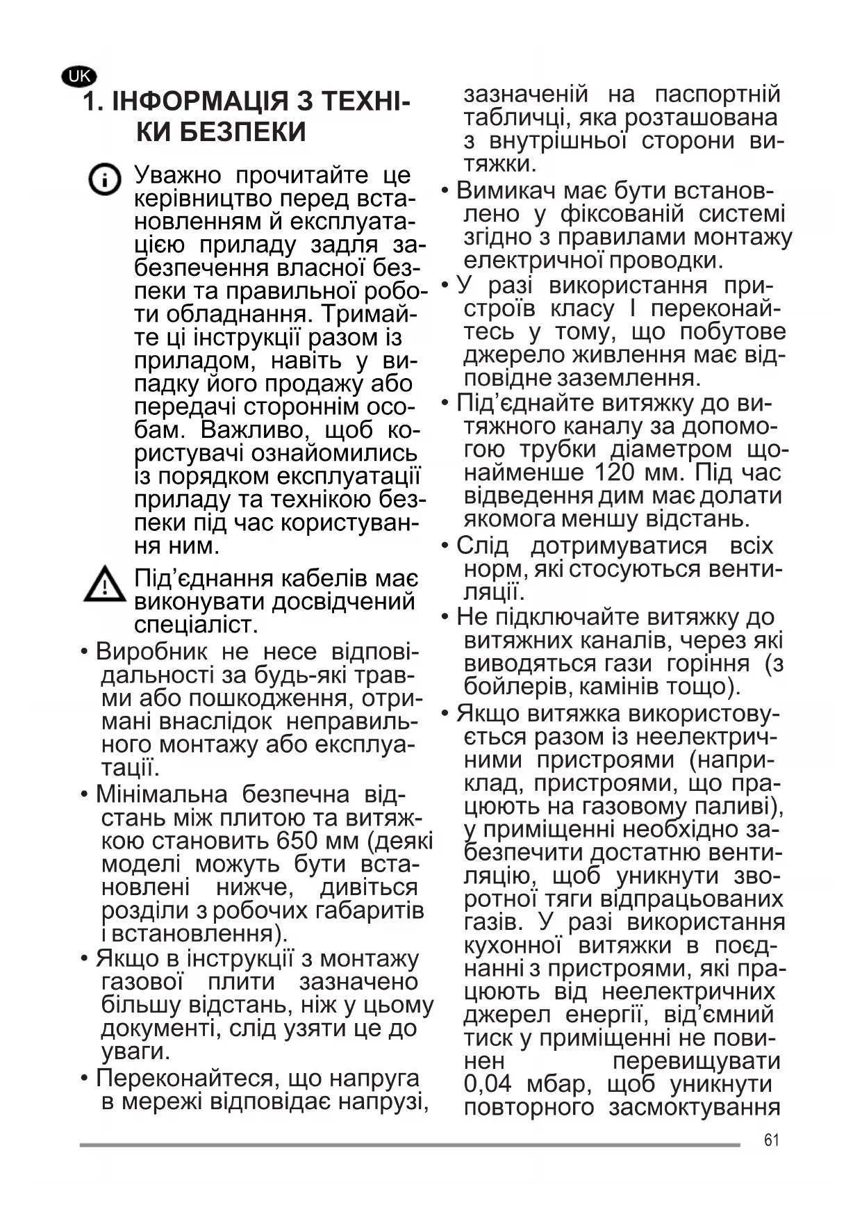 - Якщо витяжка використову- ється разом із неелектрич- ними пристроями (напри- клад, пристроями, що пра- цюють на газовому паливі), у приміщенні необхідно за- безпечити достатню венти- ляцію, щоб уникнути зво- ротної тяги відпрацьованих газів. У разі використання кухонної витяжки в поєд- нанні з пристроями, які пра- цюють від неелектричних джерел енергії, від’ємний тиск у приміщенні не пови- нен перевищувати 0,04 мбар, щоб уникнути повторного засмоктування 61витяжкою газів назад у при-