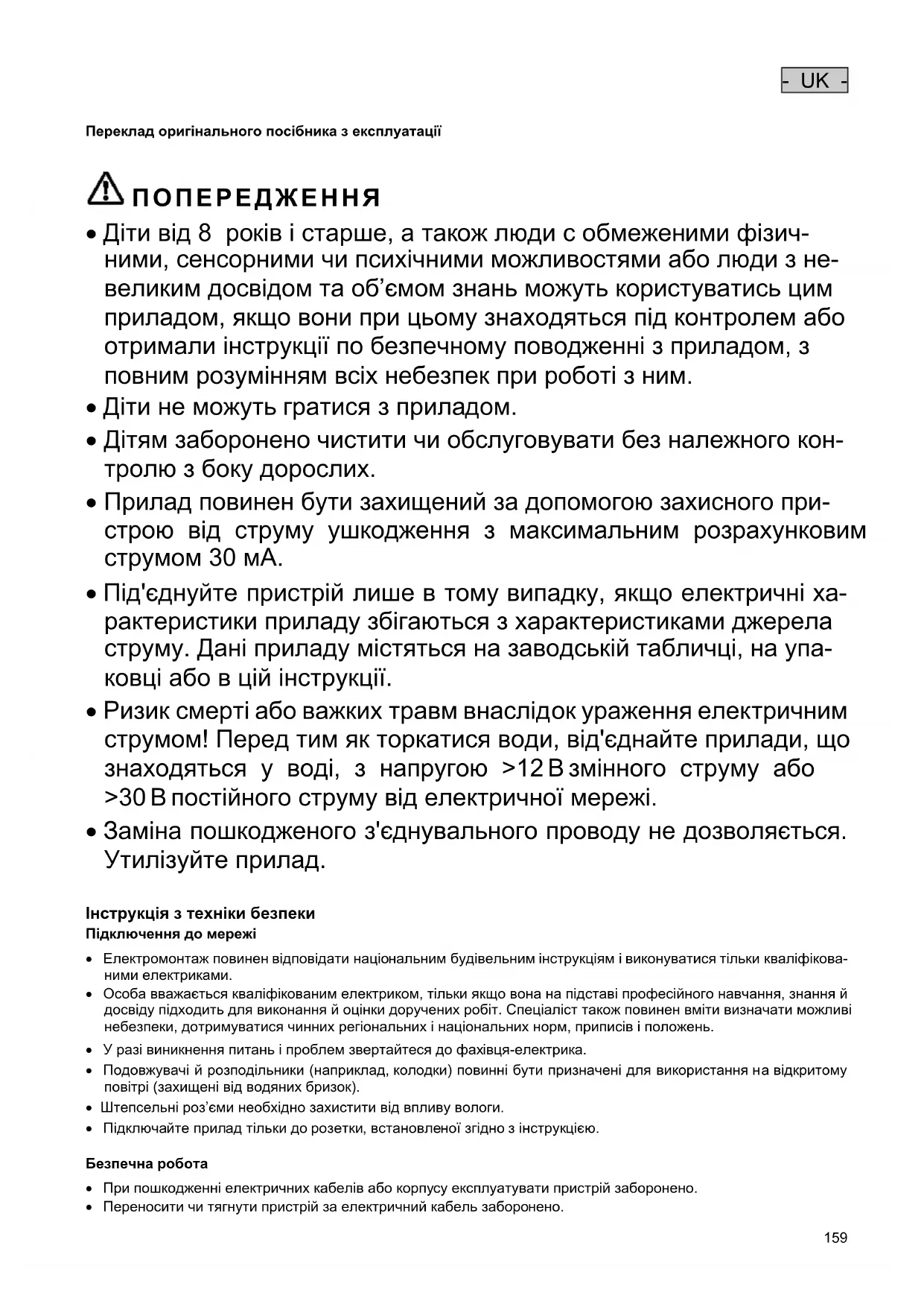 - Діти від 8 років і старше, а також люди с обмеженими фізич- ними, сенсорними чи психічними можливостями або люди з не- великим досвідом та об’ємом знань можуть користуватись цим приладом, якщо вони при цьому знаходяться під контролем або отримали інструкції по безпечному поводженні з приладом, з повним розумінням всіх небезпек при роботі з ним.