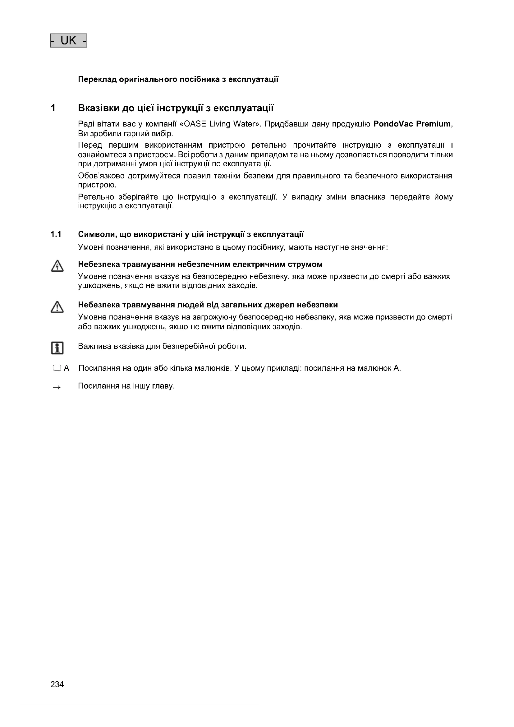 1 Вказівки до цієї інструкції з експлуатації Раді вітати вас у компанії «OASE Living Water». Придбавши дану продукцію PondoVac Premium, Ви зробили гарний вибір. Перед першим використанням пристрою ретельно прочитайте інструкцію з експлуатації і ознайомтеся з пристроєм. Всі роботи з даним приладом та на ньому дозволяється проводити тільки при дотриманні умов цієї інструкції по експлуатації. Обов’язково дотримуйтеся правил техніки безпеки для правильного та безпечного використання