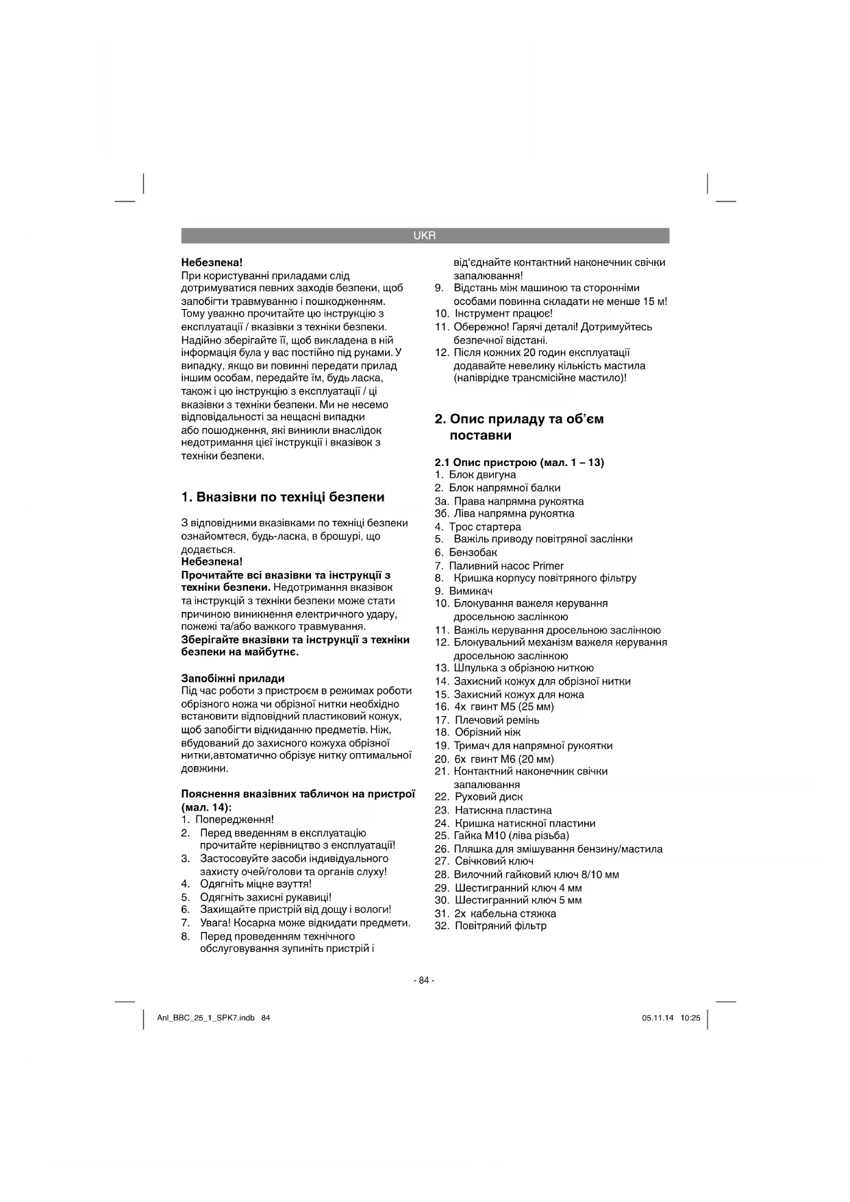 пошкодження пристрою та становить серйозну небезпеку для користувача. Обов‘язково дотримуйтесь обмежень, зазначених у правилах техніки безпеки. Зверніть увагу, що за своєю конструкцією наші пристрої не призначено для використання у комерційних, торговельних або промислових цілях. Ми не несемо жодної відповідальності, якщо пристрій використовується у комерційних, торговельних, промислових або інших аналогічних цілях. Небезпечно! Для запобігання травмуванню користувача бензинову мотокосарку заборонено використовувати для наступних робіт: очищення тротуарів та рубання чи подрібнення відрізаних частин дерев та кущів. Крім того, бензинову мотокосарку не можна використовувати для розрівнювання невеликих височин, наприклад, земельних пагорбів, розритих кротами. З міркувань безпеки бензинова мотокосарка не має використовуватися у якості привідного агрегату для інших робочих інструментів та інструментальних засобів будь-якого виду. Пристрій дозволено використовувати тільки за його призначенням. Будь-яке інше використання вважається використанням не за призначенням. За будь-яке заподіяне пошкодження або травмування будь-якого виду несе відповідальність користувач/ оператор, а не виробник. Anl_BBC_25_1_SPK7.indb 85Anl_BBC_25_1_SPK7.indb 85 05.11.14 10:2505.11.14 10:25UKR