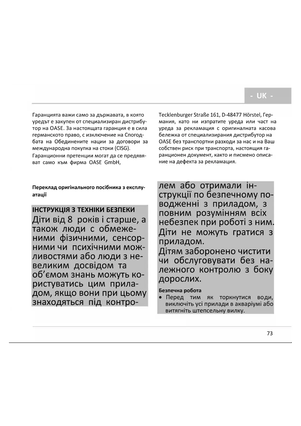 Компанія OASE GmbH як виробник надає гара- нтію на пристрій OASE, який ви придбали, згі- дно з наведеними нижче умовами строком на 36 місяці. Відлік гарантійного строку розпочи- нається з моменту купівлі у спеціалізованого дилера OASE. У випадку повторного продажу гарантійний строк не поновлюється. При гара- нтійному обслуговуванні гарантійний строк не продовжується і не поновлюється. Ваші за- конні права як покупця, зокрема ті, що випли- вають із гарантійних зобов’язань, і далі нале- жать вам і не порушуються цією гарантією. Умови надання гарантії Компанія OASE GmbH гарантує бездоганні властивості своїх виробів та обробку матеріа- лів відповідно до призначення, кваліфіковану збірку та належне функціонування. У гарантій- ному випадку на вибір виробника здійсню- ється безкоштовний ремонт, безкоштовно надсилаються запчастини або новий виріб на заміну придбаному. Якщо пристрої такого типу, як ви придбали, більше не виготовля- ється, ми залишаємо за собою право наді- слати вам інший пристрій на заміну з нашого асортименту, який максимально схожий на той, що підлягає гарантійній заміні. Гарантія не поширюється на випадки, пов’язані з поми- лками при встановленні та експлуатації, недо- статнім доглядом, застосуванням непридат- них засобів чищення, відмовою від технічного обслуговування, використанням не за призна- ченням, пошкодженнями в результаті аварій, ударами, дією низьких температур, відрізан- ням штекера, вкороченням кабелю, відкла- деннями накипу або спробами некваліфікова- ного ремонту. У зв’язку з цим для забезпе- чення належного використання наполегливо радимо дотримуватися інструкції. Дотри- мання інструкції є однією з умов надання га- рантії. Гарантія не поширюється на витратні матеріали та деталі, які швидко зношуються, наприклад, лампочки.- RU -