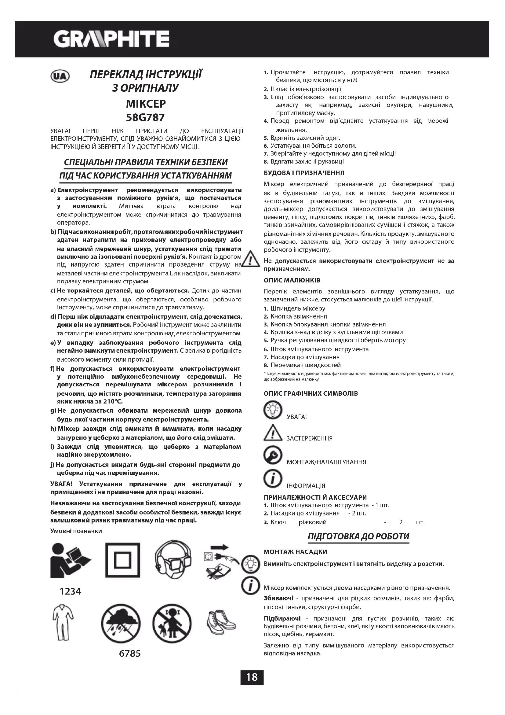 надійно знерухомлено. j) Не допускається вкидати будь-які сторонні предмети до цеберка під час перемішування. УВАГА! Устаткування призначене для експлуатації у приміщеннях і не призначене для праці назовні. Незважаючи на застосування безпечної конструкції, заходи безпеки й додаткові засоби особистої безпеки, завжди існує залишковий ризик травматизму під час праці. Умовні позначки