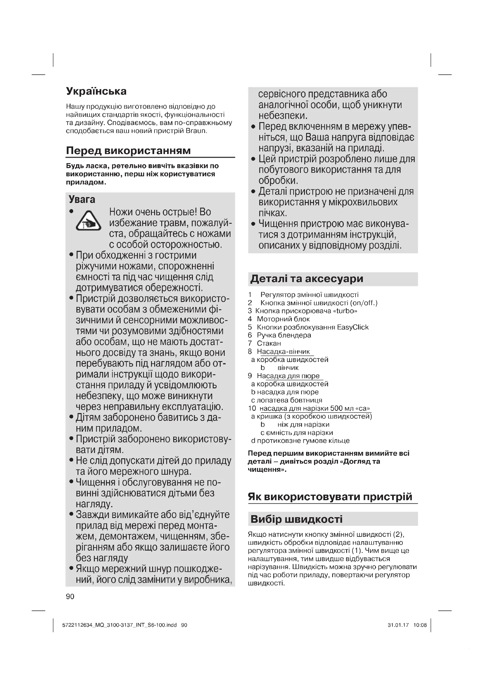 5722112634_MQ_3100-3137_INT_S6-100.indd 905722112634_MQ_3100-3137_INT_S6-100.indd 90 31.01.17 10:0831.01.17 10:0891 Максимальної швидкості обробки можна досягти шляхом натискання кнопки «turbo» (3). Кнопку «turbo» також можна використовувати для миттєвих потужних імпульсів замість того, щоб перемикати регулятор швидкості. Насадка-блендер (А) Ручний блендер ідеально пасує для приготування підлив, соусів, приправ до салатів, супів, дитячого харчування, а також напоїв, молочних та інших