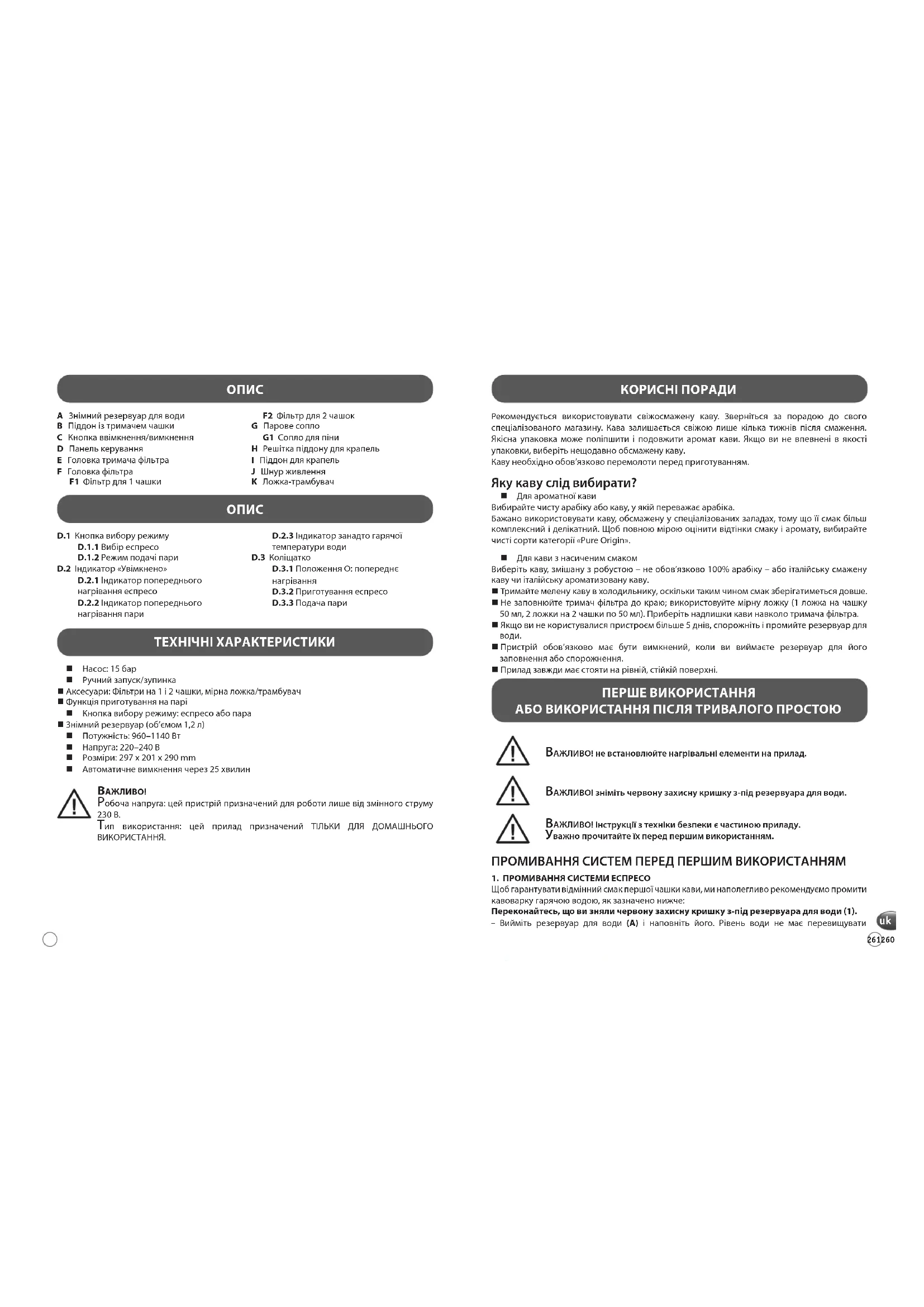 Пристрій обов’язково має бути вимкнений, коли ви виймаєте резервуар для його заповнення або спорожнення. Прилад завжди має стояти на рівній, стійкій поверхні. ТЕХНІЧНІ ХАРАКТЕРИСТИКИ Насос: 15 бар Ручний запуск/зупинка Аксесуари: Фільтри на 1 і 2 чашки, мірна ложка/трамбувач Функція приготування на парі Кнопка вибору режиму: еспресо або пара Знімний резервуар (об’ємом 1,2 л) Потужність: 960–1140 Вт Напруга: 220–240В Розміри: 297 x 201 x 290 mm Автоматичне вимкнення через 25 хвилин