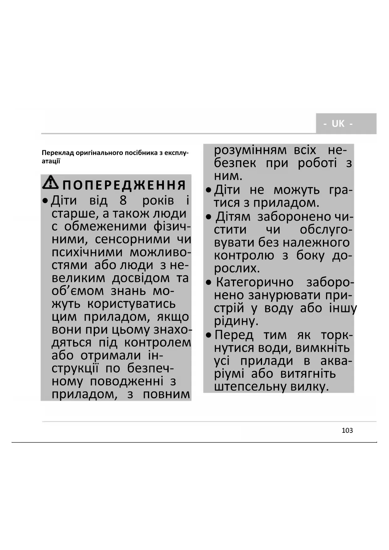 - Перед тим як торк- нутися води, вимкніть усі прилади в аква- ріумі або витягніть штепсельну вилку.- UK -