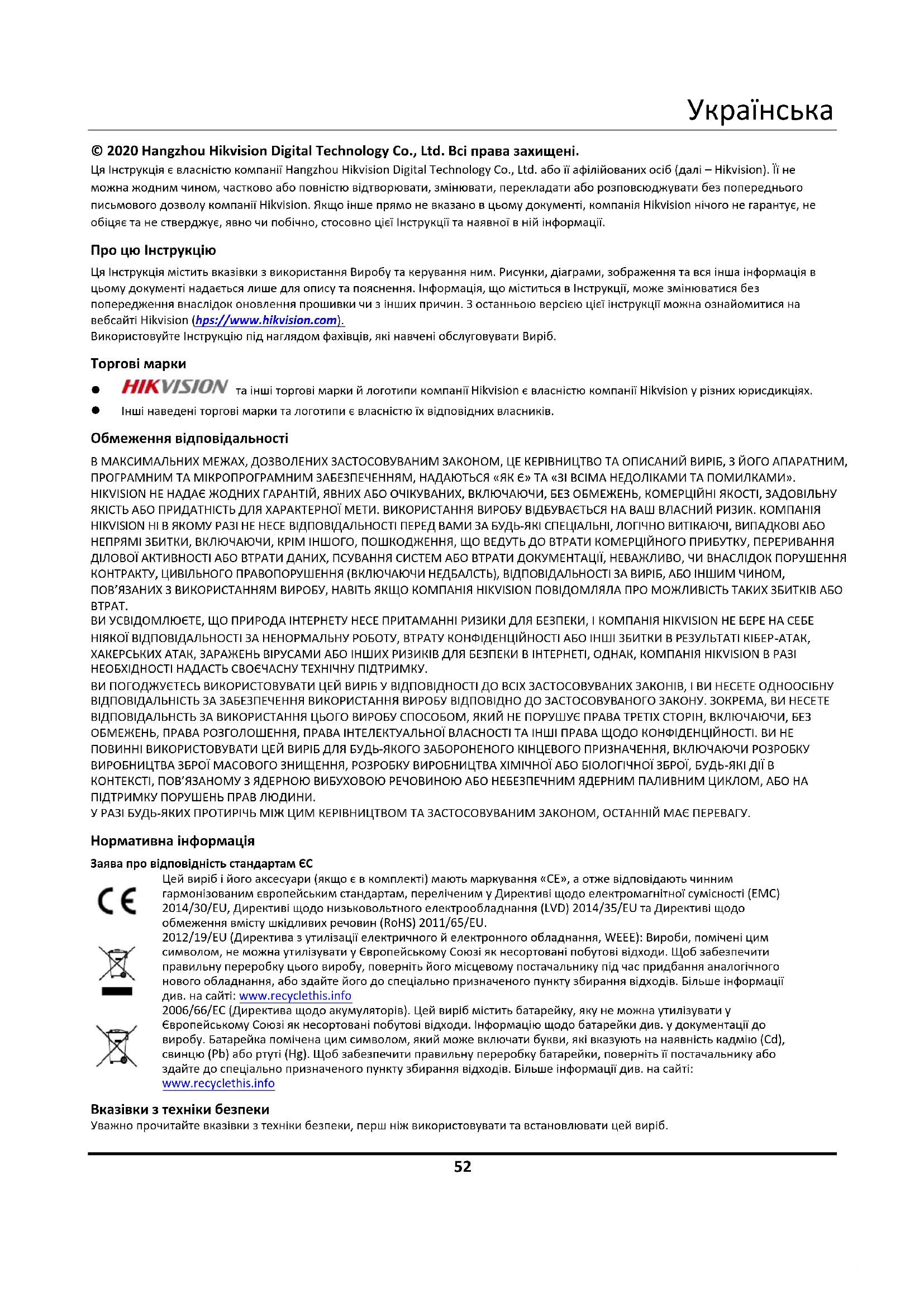 © 2020 Hangzhou Hikvision Digital Technology Co., Ltd. Всі права захищені. Ця Інструкція є власністю компанії Hangzhou Hikvision Digital Technology Co., Ltd. або її афілійованих осіб (далі – Hikvision). Її не можна жодним чином, частково або повністю відтворювати, змінювати, перекладати або розповсюджувати без попереднього письмового дозволу компанії Hikvision. Якщо інше прямо не вказано в цьому документі, компанія Hikvision нічого не гарантує, не обіцяє та не стверджує, явно чи побічно, стосовно цієї Інструкції та наявної в ній інформації. Про цю Інструкцію Ця Інструкція містить вказівки з використання Виробу та керування ним. Рисунки, діаграми, зображення та вся інша інформація в цьому документі надається лише для опису та пояснення. Інформація, що міститься в Інструкції, може змінюватися без попередження внаслідок оновлення прошивки чи з інших причин. З останньою версією цієї інструкції можна ознайомитися на вебсайті Hikvision (https://www.hikvision.com). Використовуйте Інструкцію під наглядом фахівців, які навчені обслуговувати Виріб. Торгові марки та інші торгові марки й логотипи компанії Hikvision є власністю компанії Hikvision у різних юрисдикціях. Інші наведені торгові марки та логотипи є власністю їх відповідних власників. Обмеження відповідальності В МАКСИМАЛЬНИХ МЕЖАХ, ДОЗВОЛЕНИХ ЗАСТОСОВУВАНИМ ЗАКОНОМ, ЦЕ КЕРІВНИЦТВО ТА ОПИСАНИЙ ВИРІБ, З ЙОГО АПАРАТНИМ, ПРОГРАМНИМ ТА МІКРОПРОГРАМНИМ ЗАБЕЗПЕЧЕННЯМ, НАДАЮТЬСЯ «ЯК Є» ТА «ЗІ ВСІМА НЕДОЛІКАМИ ТА ПОМИЛКАМИ». HIKVISION НЕ НАДАЄ ЖОДНИХ ГАРАНТІЙ, ЯВНИХ АБО ОЧІКУВАНИХ, ВКЛЮЧАЮЧИ, БЕЗ ОБМЕЖЕНЬ, КОМЕРЦІЙНІ ЯКОСТІ, ЗАДОВІЛЬНУ ЯКІСТЬ АБО ПРИДАТНІСТЬ ДЛЯ ХАРАКТЕРНОЇ МЕТИ. ВИКОРИСТАННЯ ВИРОБУ ВІДБУВАЄТЬСЯ НА ВАШ ВЛАСНИЙ РИЗИК. КОМПАНІЯ HIKVISION НІ В ЯКОМУ РАЗІ НЕ НЕСЕ ВІДПОВІДАЛЬНОСТІ ПЕРЕД ВАМИ ЗА БУДЬ-ЯКІ СПЕЦІАЛЬНІ, ЛОГІЧНО ВИТІКАЮЧІ, ВИПАДКОВІ АБО НЕПРЯМІ ЗБИТКИ, ВКЛЮЧАЮЧИ, КРІМ ІНШОГО, ПОШКОДЖЕННЯ, ЩО ВЕДУТЬ ДО ВТРАТИ КОМЕРЦІЙНОГО ПРИБУТКУ, ПЕРЕРИВАННЯ ДІЛОВОЇ АКТИВНОСТІ АБО ВТРАТИ ДАНИХ, ПСУВАННЯ СИСТЕМ АБО ВТРАТИ ДОКУМЕНТАЦІЇ, НЕВАЖЛИВО, ЧИ ВНАСЛІДОК ПОРУШЕННЯ КОНТРАКТУ, ЦИВІЛЬНОГО ПРАВОПОРУШЕННЯ (ВКЛЮЧАЮЧИ НЕДБАЛСТЬ), ВІДПОВІДАЛЬНОСТІ ЗА ВИРІБ, АБО ІНШИМ ЧИНОМ, ПОВ’ЯЗАНИХ З ВИКОРИСТАННЯМ ВИРОБУ, НАВІТЬ ЯКЩО КОМПАНІЯ HIKVISION ПОВІДОМЛЯЛА ПРО МОЖЛИВІСТЬ ТАКИХ ЗБИТКІВ АБО ВТРАТ. ВИ УСВІДОМЛЮЄТЕ, ЩО ПРИРОДА ІНТЕРНЕТУ НЕСЕ ПРИТАМАННІ РИЗИКИ ДЛЯ БЕЗПЕКИ, І КОМПАНІЯ HIKVISION НЕ БЕРЕ НА СЕБЕ НІЯКОЇ ВІДПОВІДАЛЬНОСТІ ЗА НЕНОРМАЛЬНУ РОБОТУ, ВТРАТУ КОНФІДЕНЦІЙНОСТІ АБО ІНШІ ЗБИТКИ В РЕЗУЛЬТАТІ КІБЕР-АТАК, ХАКЕРСЬКИХ АТАК, ЗАРАЖЕНЬ ВІРУСАМИ АБО ІНШИХ РИЗИКІВ ДЛЯ БЕЗПЕКИ В ІНТЕРНЕТІ, ОДНАК, КОМПАНІЯ HIKVISION В РАЗІ НЕОБХІДНОСТІ НАДАСТЬ СВОЄЧАСНУ ТЕХНІЧНУ ПІДТРИМКУ. ВИ ПОГОДЖУЄТЕСЬ ВИКОРИСТОВУВАТИ ЦЕЙ ВИРІБ У ВІДПОВІДНОСТІ ДО ВСІХ ЗАСТОСОВУВАНИХ ЗАКОНІВ, І ВИ НЕСЕТЕ ОДНООСІБНУ ВІДПОВІДАЛЬНІСТЬ ЗА ЗАБЕЗПЕЧЕННЯ ВИКОРИСТАННЯ ВИРОБУ ВІДПОВІДНО ДО ЗАСТОСОВУВАНОГО ЗАКОНУ. ЗОКРЕМА, ВИ НЕСЕТЕ ВІДПОВІДАЛЬНСТЬ ЗА ВИКОРИСТАННЯ ЦЬОГО ВИРОБУ СПОСОБОМ, ЯКИЙ НЕ ПОРУШУЄ ПРАВА ТРЕТІХ СТОРІН, ВКЛЮЧАЮЧИ, БЕЗ ОБМЕЖЕНЬ, ПРАВА РОЗГОЛОШЕННЯ, ПРАВА ІНТЕЛЕКТУАЛЬНОЇ ВЛАСНОСТІ ТА ІНШІ ПРАВА ЩОДО КОНФІДЕНЦІЙНОСТІ. ВИ НЕ ПОВИННІ ВИКОРИСТОВУВАТИ ЦЕЙ ВИРІБ ДЛЯ БУДЬ-ЯКОГО ЗАБОРОНЕНОГО КІНЦЕВОГО ПРИЗНАЧЕННЯ, ВКЛЮЧАЮЧИ РОЗРОБКУ ВИРОБНИЦТВА ЗБРОЇ МАСОВОГО ЗНИЩЕННЯ, РОЗРОБКУ ВИРОБНИЦТВА ХІМІЧНОЇ АБО БІОЛОГІЧНОЇ ЗБРОЇ, БУДЬ-ЯКІ ДІЇ В КОНТЕКСТІ, ПОВ’ЯЗАНОМУ З ЯДЕРНОЮ ВИБУХОВОЮ РЕЧОВИНОЮ АБО НЕБЕ