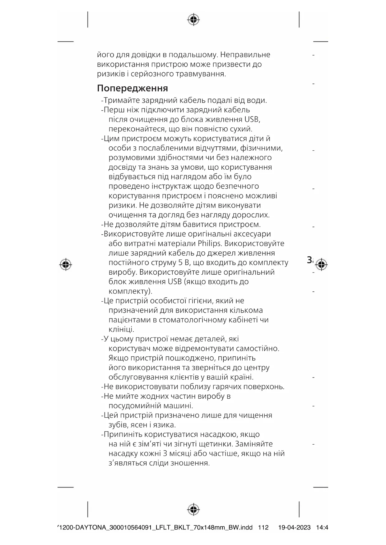 Використовуйте цей пристрій за призначенням. Перш ніж використовувати пристрій, його батареї та приладдя, уважно прочитайте цей буклет із важливою інформацією та зберігайте HY1200-DAYTONA_300010564091_LFLT_BKLT_70x148mm_BW.indd 111HY1200-DAYTONA_300010564091_LFLT_BKLT_70x148mm_BW.indd 111 19-04-2023 14:4919-04-2023 14:49його для довідки в подальшому. Неправильне використання пристрою може призвести до ризиків і серйозного травмування. Попередження - Тримайте зарядний кабель подалі від води. - Перш ніж підключити зарядний кабель після очищення до блока живлення USB, переконайтеся, що він повністю сухий. - Цим пристроєм можуть користуватися діти й особи з послабленими відчуттями, фізичними, розумовими здібностями чи без належного досвіду та знань за умови, що користування відбувається під наглядом або їм було проведено інструктаж щодо безпечного користування пристроєм і пояснено можливі ризики. Не дозволяйте дітям виконувати очищення та догляд без нагляду дорослих. - Не дозволяйте дітям бавитися пристроєм. - Використовуйте лише оригінальні аксесуари або витратні матеріали Philips. Використовуйте лише зарядний кабель до джерел живлення постійного струму 5В, що входить до комплекту виробу. Використовуйте лише оригінальний блок живлення USB (якщо входить до комплекту). - Це пристрій особистої гігієни, який не призначений для використання кількома пацієнтами в стоматологічному кабінеті чи