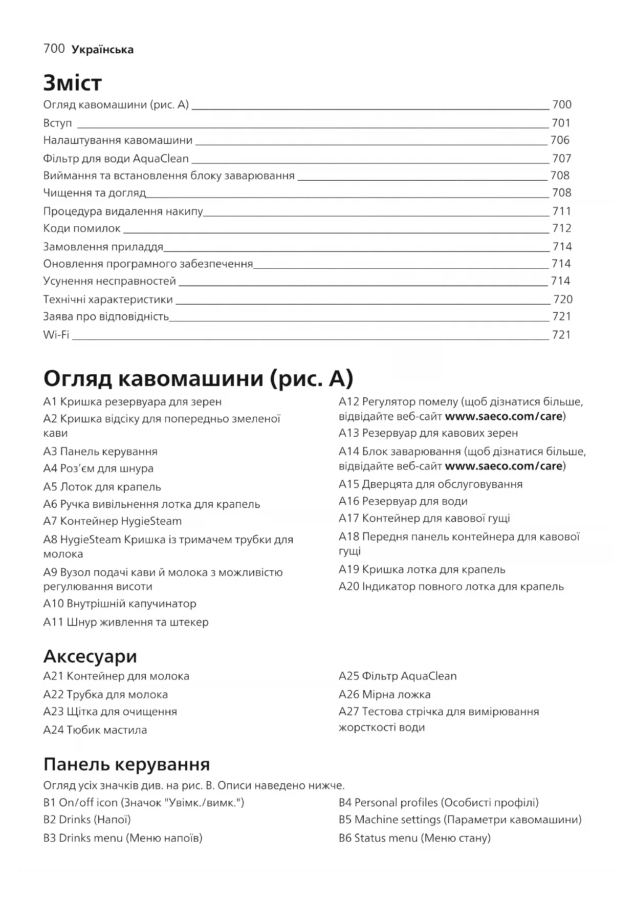 Огляд кавомашини (рис.A) _______________________________________________________________ 700 Вступ ___________________________________________________________________________________ 701 Налаштування кавомашини ______________________________________________________________ 706 Фільтр для води AquaClean _______________________________________________________________ 707 Виймання та встановлення блоку заварювання ____________________________________________ 708 Чищення та догляд_______________________________________________________________________ 708 Процедура видалення накипу_____________________________________________________________ 711 Коди помилок ___________________________________________________________________________ 712 Замовлення приладдя____________________________________________________________________ 714 Оновлення програмного забезпечення____________________________________________________ 714 Усунення несправностей _________________________________________________________________ 714 Технічні характеристики __________________________________________________________________ 720 Заява про відповідність___________________________________________________________________ 721 Wi-Fi ____________________________________________________________________________________ 721 Огляд кавомашини (рис.A) A1 Кришка резервуара для зерен A2 Кришка відсіку для попередньо змеленої