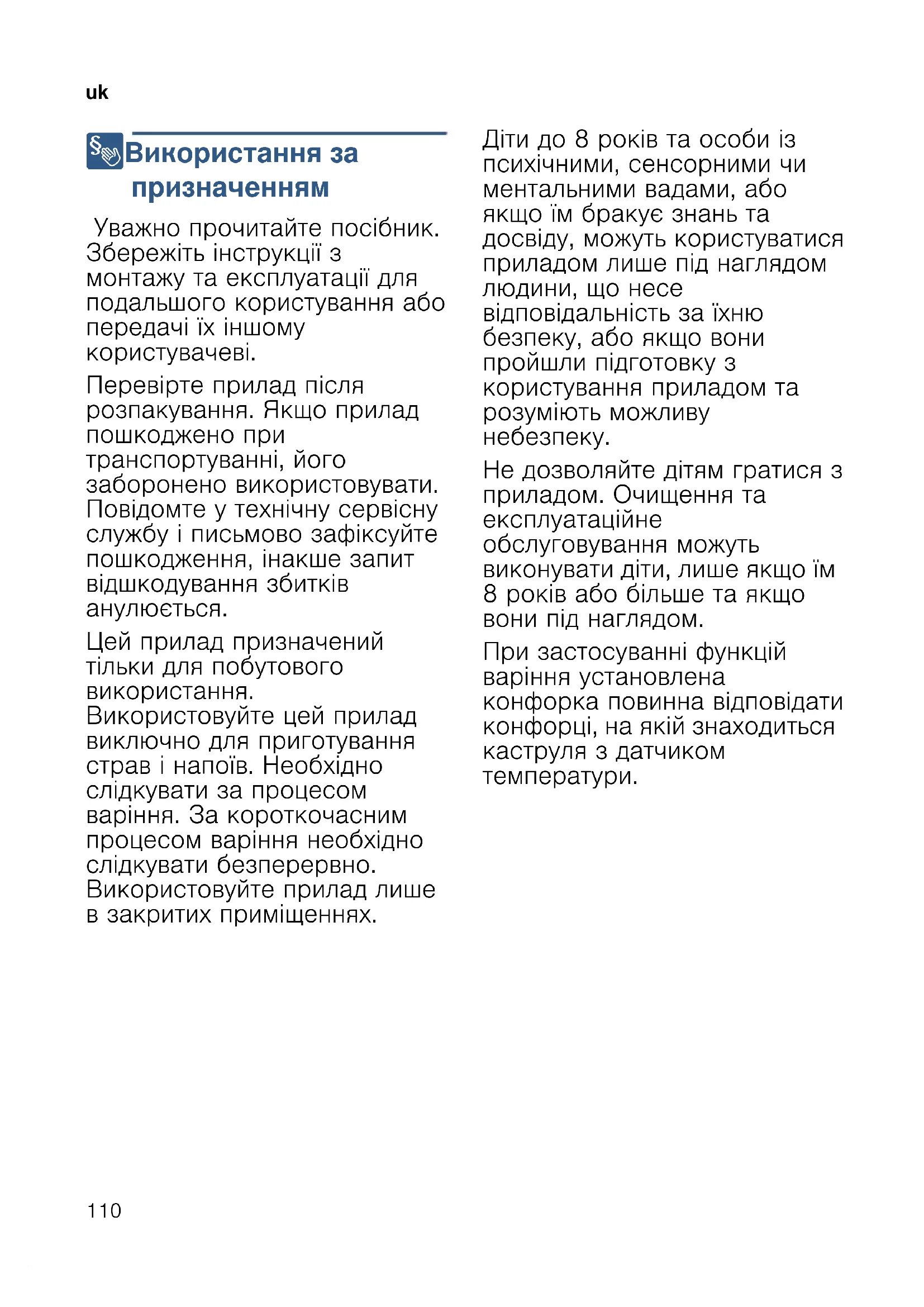 Не дозволяйте дітям гратися з приладом. Очищення та експлуатаційне обслуговування можуть виконувати діти, лише якщо їм 8 років або більше та якщо вони під наглядом. При застосуванні функцій варіння установлена конфорка повинна відповідати конфорці, на якій знаходиться каструля з датчиком температури.uk