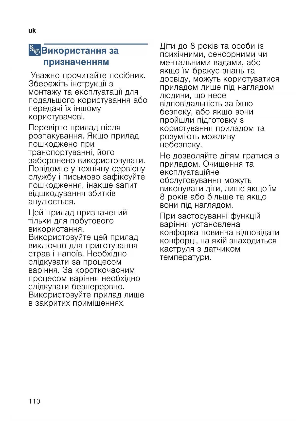 Не дозволяйте дітям гратися з приладом. Очищення та експлуатаційне обслуговування можуть виконувати діти, лише якщо їм 8 років або більше та якщо вони під наглядом. При застосуванні функцій варіння установлена конфорка повинна відповідати конфорці, на якій знаходиться каструля з датчиком температури.uk