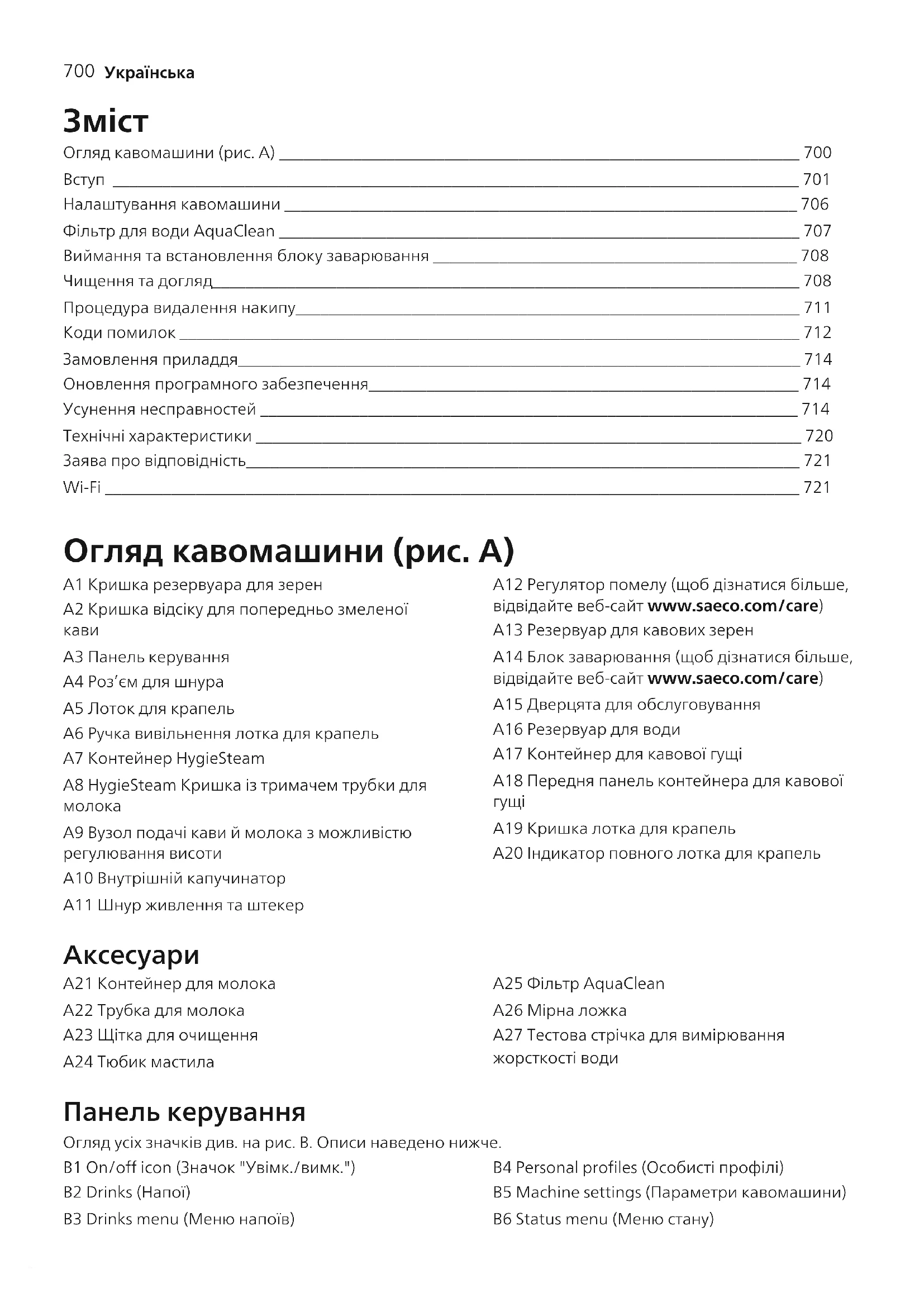 Огляд кавомашини (рис.A) _______________________________________________________________ 700 Вступ ___________________________________________________________________________________ 701 Налаштування кавомашини ______________________________________________________________ 706 Фільтр для води AquaClean _______________________________________________________________ 707 Виймання та встановлення блоку заварювання ____________________________________________ 708 Чищення та догляд_______________________________________________________________________ 708 Процедура видалення накипу_____________________________________________________________ 711 Коди помилок ___________________________________________________________________________ 712 Замовлення приладдя____________________________________________________________________ 714 Оновлення програмного забезпечення____________________________________________________ 714 Усунення несправностей _________________________________________________________________ 714 Технічні характеристики __________________________________________________________________ 720 Заява про відповідність___________________________________________________________________ 721 Wi-Fi ____________________________________________________________________________________ 721 Огляд кавомашини (рис.A) A1 Кришка резервуара для зерен A2 Кришка відсіку для попередньо змеленої