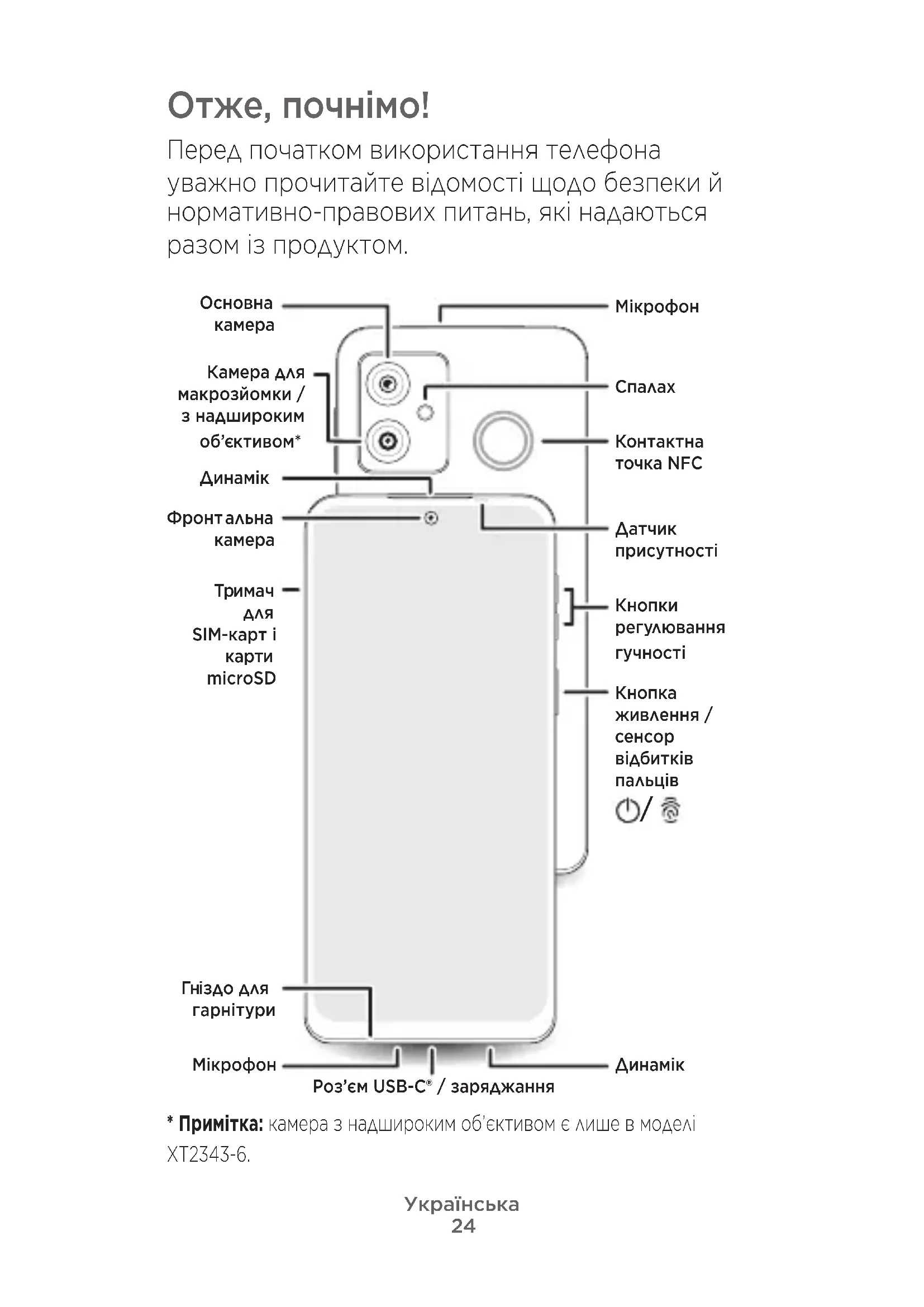 Утилізація та переробка відходів. Щоб дізнатися, як правильно утилізувати продукти й пакування, відвідайте вебсторінку www.motorola.com/recycling. Високі й низькі температури. Не використовуйте телефон за температури нижче –20°C (–4°F) або вище 45°C (113°F). Не зберігайте та не транспортуйте телефон за температури нижче –20°C (–4°F) або вище 60°C (140°F). Заяви про відмову від відповідальності. Для роботи функцій, послуг і програм потрібне підключення до мережі; вони можуть бути недоступні в деяких регіонах; можуть застосовуватися додаткові умови та/або стягуватися додаткові збори. Технічні характеристики виробу та інша наведена тут інформація актуальні на момент створення посібника. Компанія Motorola залишає за собою право виправляти чи змінювати будь-яку інформацію або технічні характеристики без попереднього сповіщення. Арбітражний розгляд. Будь-які суперечки щодо придбаного вами товару вирішуються в порядку арбітражного розгляду, рішення якого мають обов’язкову силу. Докладна інформація про арбітражний розгляд і про те, як відмовитися від нього, наведена в довіднику з правових питань, що постачається разом із телефоном. Інформація щодо рівня SAR (на електронній етикетці). Щоб переглянути відомості про питомий рівень поглинання (SAR) цього телефона, проведіть пальцем угору по головному екрану й торкніться пункту Налаштування> , введіть "Етикетки сертифікації", а потім введіть *#07# на панелі набору телефона. Цю інформацію можна також переглянути на вебсторінці www.motorola.com/sar. Підтримувані частоти та потужність (модель XT2343-2, XT2343-6). Цей телефон може працювати на зазначених нижче частотах залежно від розташування й доступності сигналу
