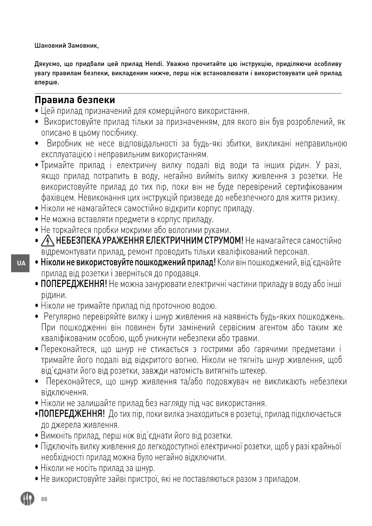 Шановний Замовник, Дякуємо, що придбали цей прилад Hendi. Уважно прочитайте цю інструкцію, приділяючи особливу увагу правилам безпеки, викладеним нижче, перш ніж встановлювати і використовувати цей прилад