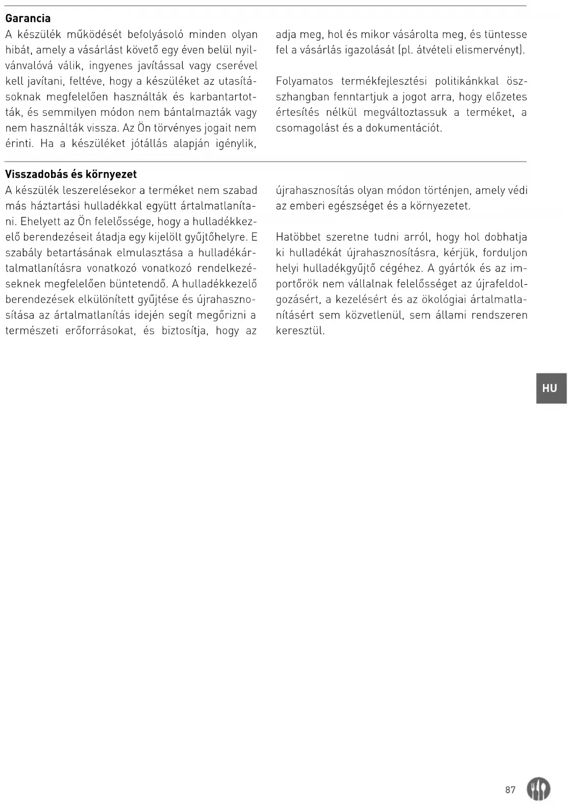 Будь-який дефект, що впливає на функціональ- ність приладу, який стає очевидним протягом од- ного року після покупки, буде відремонтований безкоштовним ремонтом або заміною за умови, що прилад був використаний і підтримується відповідно до інструкцій, і жодним чином не був зловживаний або зловживаний. Ваші законні права не зачіпаються. Якщо прилад заявлений по гарантії, вкажіть, де і коли він був придбаний, і додайте підтвердження покупки (наприклад, квитанцію). Відповідно до нашої політики постійного розвит- ку продукції, ми залишаємо за собою право без попередження змінювати специфікації продукту, упаковки та документації. Відхилення & середовища При знятті з експлуатації приладу виріб не можна утилізувати з іншими побутовими відходами. За- мість цього, це ваша відповідальність, щоб роз- поряджатися своїм відпрацьованим обладнан- ням, передавши його в призначений пункт збору. Недотримання цього правила може бути пока- раний відповідно до чинних нормативних актів з утилізації відходів. Окремий збір і переробка вашого відпрацьованого обладнання на момент утилізації допоможе зберегти природні ресурси і гарантувати, що він переробляється таким чи- ном, що захищає здоров’я людини і навколишнє середовище. Для отримання додаткової інформації про те, де ви можете скинути свої відходи на переробку, будь ласка, зв’яжіться з місцевою компанією з збору відходів. Виробники та імпортери не беруть на себе відповідальність за утилізацію, обробку та екологічну утилізацію як безпосередньо, так і через державну систему.95