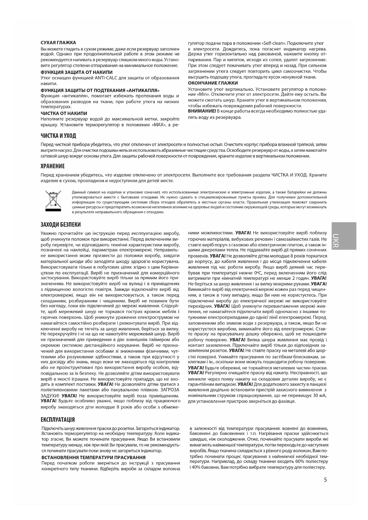Поверніть терморегулятор в позицію відповідну до того типу тка- нини, яку збираєтеся прасувати. НАПОВНЕННЯ РЕЗЕРВУАРА ВОДОЮ Перед наповненням резервуара водою відключіть виріб від мере- жі. Акуратно наповніть резервуар водою. Щоб запобігти перепо- вненню, не наливайте воду вище позначки на резервуарі. Якщо Ви хочете додати воду в процесі прасування, спочатку вимкніть праску від електромережі. ВИБІР ПОЛОЖЕННЯ ТІЛА Прасуйте, тримаючи спину прямо. Встановіть висоту прасувальної до- шки так, щоб ручка праски перебувала на одному рівні з ліктем. При правильно обраній температурі немає необхідності сильно тиснути на праску. Найкращі результати досягаються, коли білизна трохи волога. ВІДПАРЮВАННЯ Переведіть регулятор температури в положення «••» або «•••». Натис- ніть кнопку відпарювання. УВАГА! Щоб запобігти витіканню води з парових отворів, утримуйте кнопку відпарювання не більше 5 секунд. РОЗБРИЗКУВАННЯ Розбризкування може бути використано при різній температурі і різних режимах роботи виробу, якщо в резервуарі достатньо води. Для використання цієї функції натисніть на кнопку розбризкування кілька разів. ПАРОВИЙ УДАР Ця функція застосовується для додаткової разової подачі пари при розгладженні дуже зім’ятих місць. Встановіть терморегулятор в по- ложення «••» або «•••» і натисніть кнопку подачі пари. ВЕРТИКАЛЬНЕ ВІДПАРЮВАННЯ Переконайтеся, що в резервуарі достатньо води. Підключіть праску до електромережі і поставте її вертикально. Встановіть терморе- гулятор і регулятор ступеня відпарювання на максимальну пози- цію. Тримаючи праску вертикально, натисніть кнопку подачі пари. Функція захисту від протікання автоматично запобігає утворенню крапель, даючи можливість прасувати делікатні тканини без ризи- ку зіпсувати їх або поставити плями. СУХЕ ПРАСУВАННЯ Ви можете прасувати в сухому режимі навіть, якщо резервуар запо- внений водою. Однак при тривалій роботі в цьому режимі не реко- мендується наливати в резервуар занадто багато води. Встановіть регулятор ступеня відпарювання на мінімальне положення. ФУНКЦІЯ ЗАХИСТ ВІД НАКИПУ Праска оснащена функцією ANTI-CALC для захисту від утворення накипу. ФУНКЦІЯ ЗАХИСТУ ВІД ПІДТІКАННЯ «АНТИКРАПЛЯ» Функція «антикрапля» допомагає уникнути протікання води й утворення розводів на тканині, коли праска функціонує на низь- ких температурах. ЧИЩЕННЯ ВІД НАКИПУ Наповніть резервуар водою до максимальної позначки, закрийте кришку. Встановіть терморегулятор в положенні «MAX», а регу- лятор подачі пари в положенні «Self-clean». Підключіть праску до електромережі. Дочекайтеся поки погасне індикатор нагріву. Три- маючи праску горизонтально над умивальником, натисніть кнопку відпарювання. Пар і окріп, виходячи з сопел, видалять забруднення. При цьому слід похитувати праску вперед й назад. У разі сильного забруднення праски слід повторити цикл самоочищення. Щоб ви- сушити підошву праски, пропрасуйте шматок непотрібної тканини. ЗАКІНЧЕННЯ ПРАСУВАННЯ Поставте праску вертикально. Встановіть регулятор в положення «Min». Вимкніть праску від електромережі. Дайте їй охолонути. Ви можете змотати шнур. Зберігайте праску в вертикальному поло- женні, щоб уникнути пошкодження робочої поверхні. УВАГА! В кінці роботи завжди необхідно повністю видаляти воду з резервуара. Даний символ на виробі та упаковц