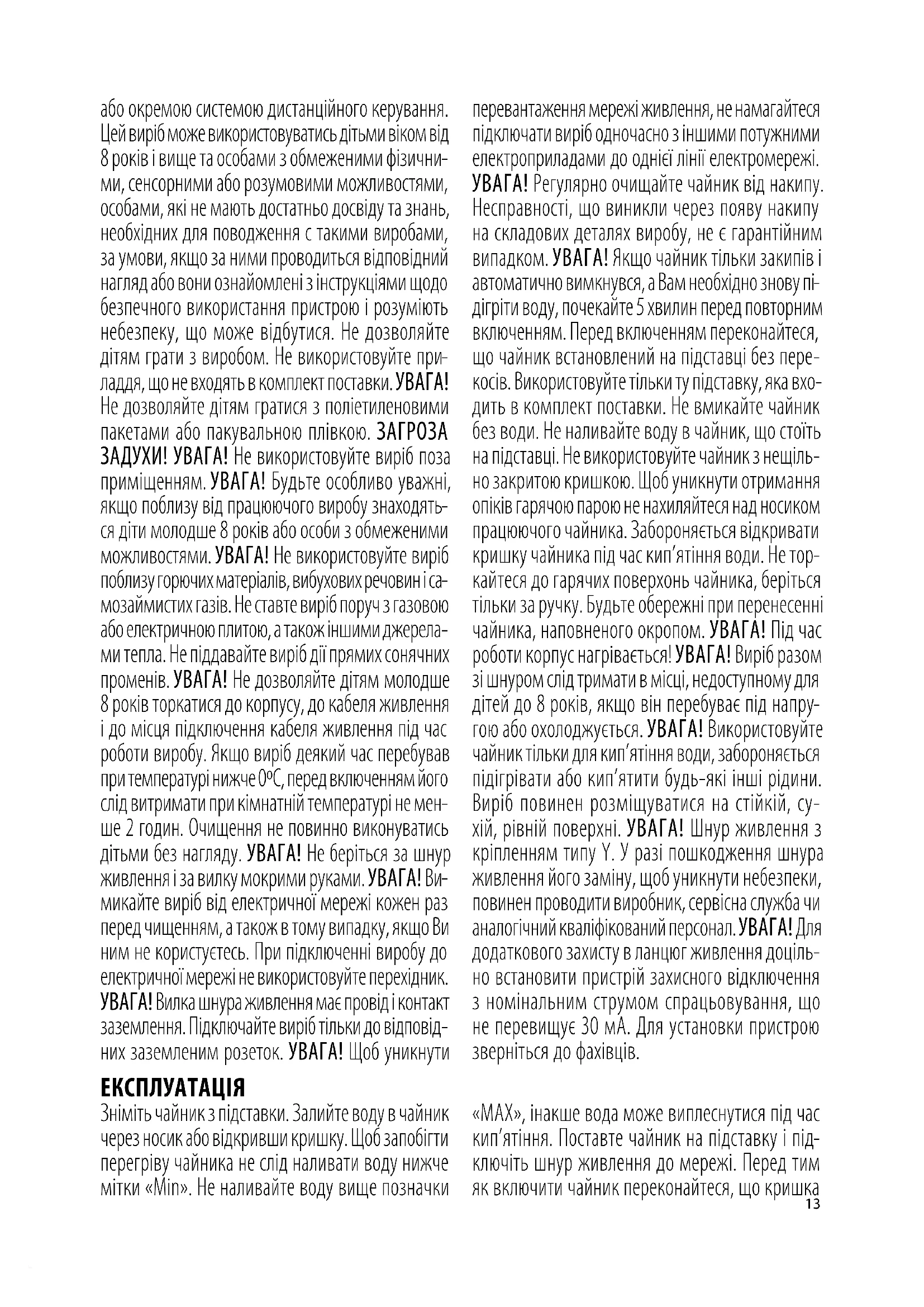 гою або охолоджується. УВАГА! Використовуйте чайник тільки для кип’ятіння води, забороняється підігрівати або кип’ятити будь-які інші рідини. Виріб повинен розміщуватися на стійкій, су