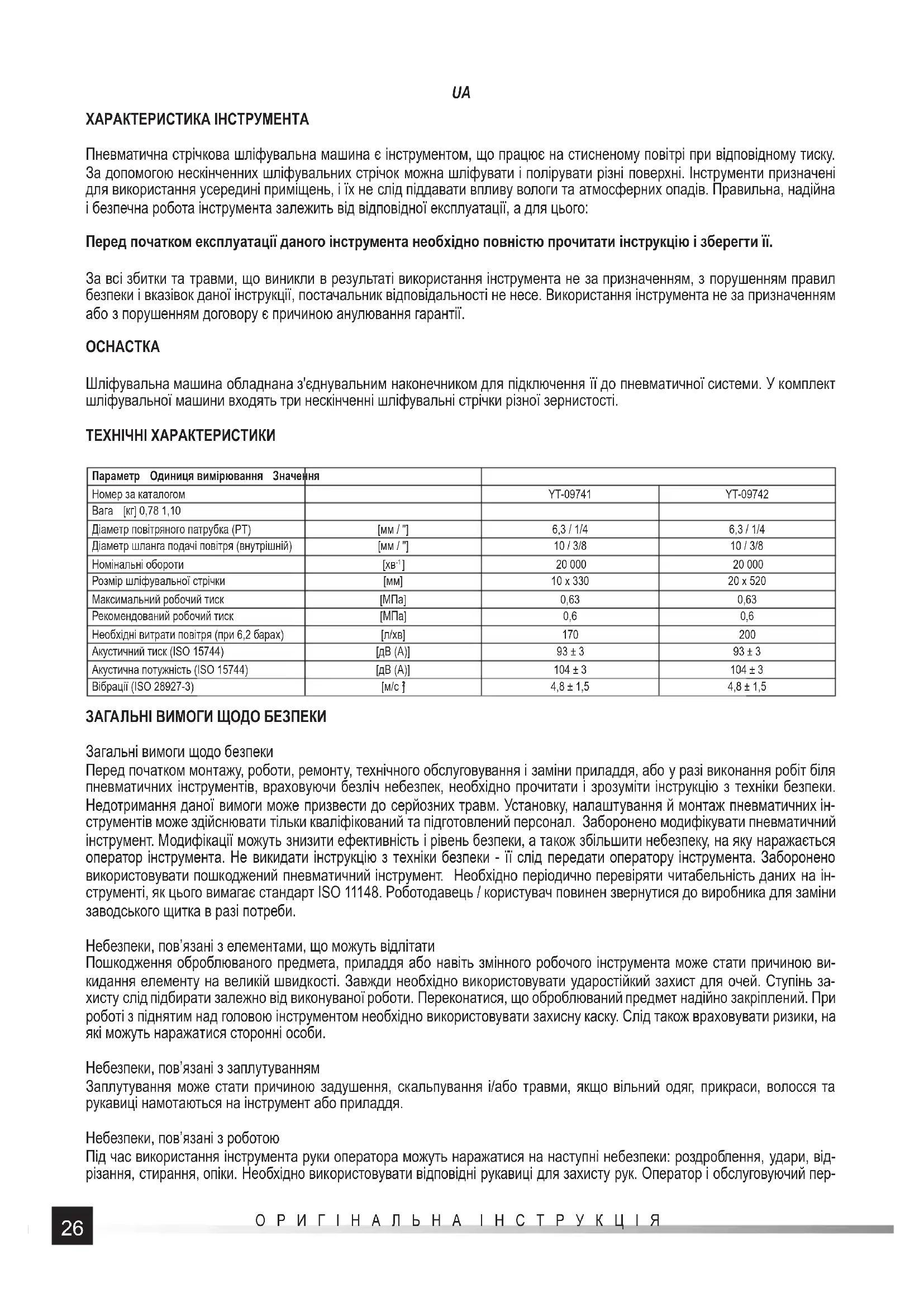 ХАРАКТЕРИСТИКА ІНСТРУМЕНТА Пневматична стрічкова шліфувальна машина є інструментом, що працює на стисненому повітрі при відповідному тиску. За допомогою нескінченних шліфувальних стрічок можна шліфувати і полірувати різні поверхні. Інструменти призначені для використання усередині приміщень, і їх не слід піддавати впливу вологи та атмосферних опадів. Правильна, надійна і безпечна робота інструмента залежить від відповідної експлуатації, а для цього: Перед початком експлуатації даного інструмента необхідно повністю прочитати інструкцію і зберегти її. За всі збитки та травми, що виникли в результаті використання інструмента не за призначенням, з порушенням правил безпеки і вказівок даної інструкції, постачальник відповідальності не несе. Використання інструмента не за призначенням