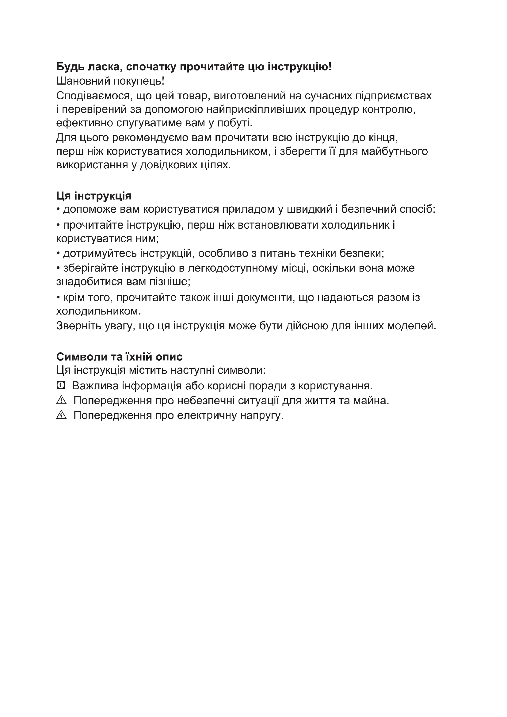 - прочитайте нструкцю, перш нж встановлювати холодилник користуватися ним;