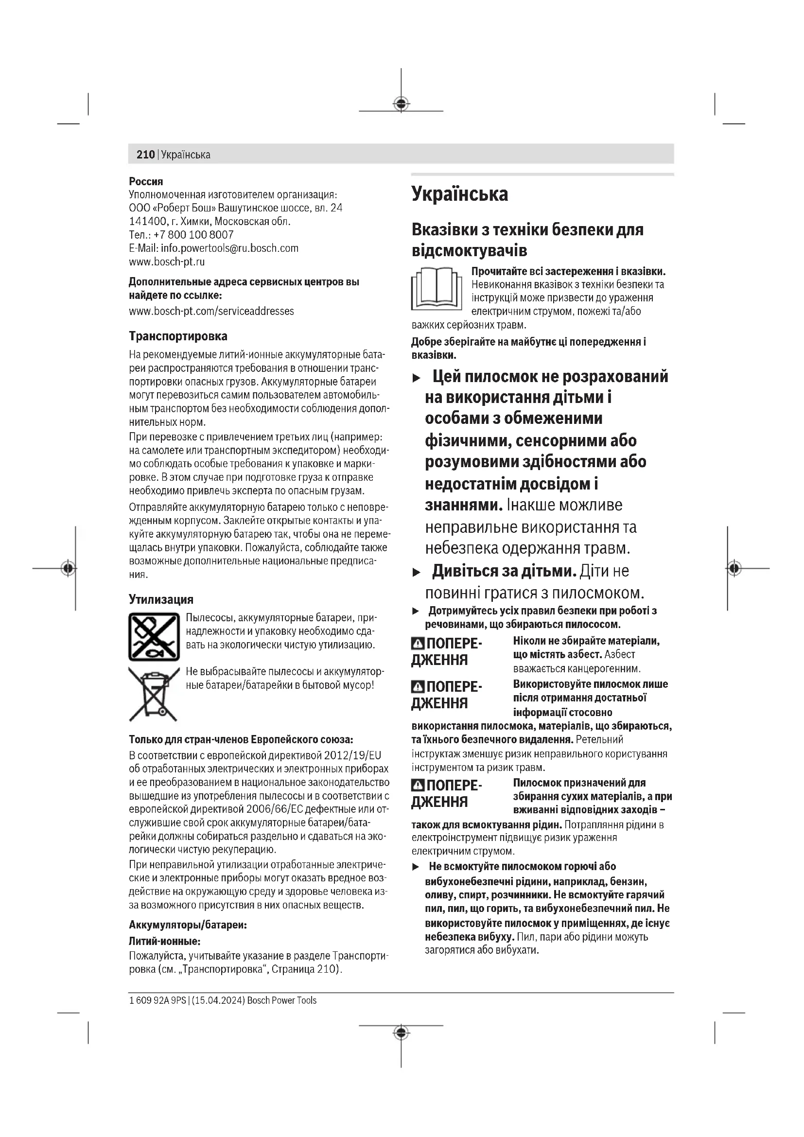 Bosch Power Tools 1 609 92A 9PS | (15.04.2024)220 | Українська – Очистіть, розбирайте та обслуговуйте пилосмок тільки в тому випадку, якщо це можна зробити без ризику для себе або інших людей. Під час технічного обслуговування та очищення використовуйте засоби індивідуального захисту. Проводьте роботи в добре провітрюваному приміщенні. – Перш ніж розбирати пилосмок, спочатку очистіть його