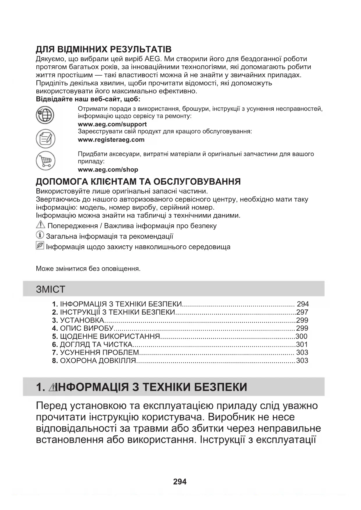 Şu sembole sahip malzemeler geri dönüştürülebilir . Ambalajı geri dönüşüm için uygun konteynerlere koyun. Elektrikli ve elektronik cihaz atıklarının geri dönüşümüne ve çevre ve insan sağlığının korunmasına yardımcı olun. Ev atığı sembolü bulunan cihazları atmayın. Ürünü yerel geri dönüşüm tesislerinize gönderin ya da belediye ile irtibata geçin. 293ДЛЯ ВІДМІННИХ РЕЗУЛЬТАТІВ Дякуємо, що вибрали цей виріб AEG. Ми створили його для бездоганної роботипротягом багатьох років, за інноваційними технологіями, які допомагають робитижиття простішим — такі властивості можна й не знайти у звичайних приладах.Приділіть декілька хвилин, щоби прочитати відомості, які допоможутьвикористовувати його максимально ефективно.Відвідайте наш веб-сайт, щоб:Отримати поради з використання, брошури, інструкції з усунення несправностей,інформацію щодо сервісу та ремонту:www.aeg.com/supportЗареєструвати свій продукт для кращого обслуговування:www.registeraeg.comПридбати аксесуари, витратні матеріали й оригінальні запчастини для вашогоприладу:www.aeg.com/shop ДОПОМОГА КЛІЄНТАМ ТА ОБСЛУГОВУВАННЯ Використовуйте лише оригінальні запасні частини.Звертаючись до нашого авторизованого сервісного центру, необхідно мати такуінформацію: модель, номер виробу, серійний номер.Інформацію можна знайти на табличці з технічними даними. Попередження / Важлива інформація про безпеку Загальна інформація та рекомендації Інформація щодо захисту навколишнього середовищаМоже змінитися без оповіщення. 1. ІНФОРМАЦІЯ З ТЕХНІКИ БЕЗПЕКИ........................................................ 2942. ІНСТРУКЦІЇ З ТЕХНІКИ БЕЗПЕКИ............................................................297