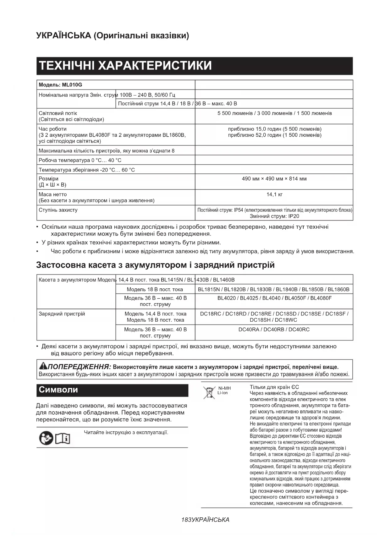 - Acumulator şi încărcător original Makita NOTĂ: Unele articole din listă pot incluse ca acce- sorii standard în ambalajul de scule. Acestea pot diferi în funcţie de ţară.183 УКРАЇНСЬКА УКРАЇНСЬКА (Оригінальні вказівки) ТЕХНІЧНІ ХАРАКТЕРИСТИКИ Модель: ML010G Номінальна напруга Змін. струм 100В – 240 В, 50/60 Гц Постійний струм 14,4 В / 18 В / 36 В – макс. 40 В Світловий потік (Світяться всі світлодіоди) 5 500 люменів / 3 000 люменів / 1 500 люменів
