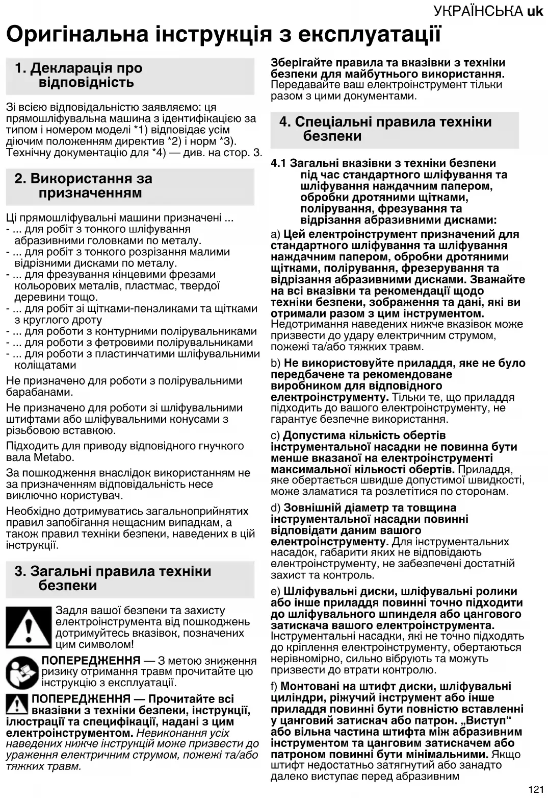 Оригінальна інструкція з експлуатації Зі всією відповідальністю заявляємо: ця прямошліфувальна машина з ідентифікацією за типом і номером моделі *1) відповідає усім діючим положенням директив *2) і норм *3). Технічну документацію для *4) — див. на стор. 3. Ці прямошліфувальні машини призначені ... - ... для робіт з тонкого шліфування абразивними головками по металу. - ... для робіт з тонкого розрізання малими відрізними дисками по металу. - ... для фрезування кінцевими фрезами кольорових металів, пластмас, твердої деревини тощо. - ... для робіт зі щітками-пензликами та щітками з круглого дроту - ... для роботи з контурними полірувальниками - ... для роботи з фетровими полірувальниками - ... для роботи з пластинчатими шліфувальними