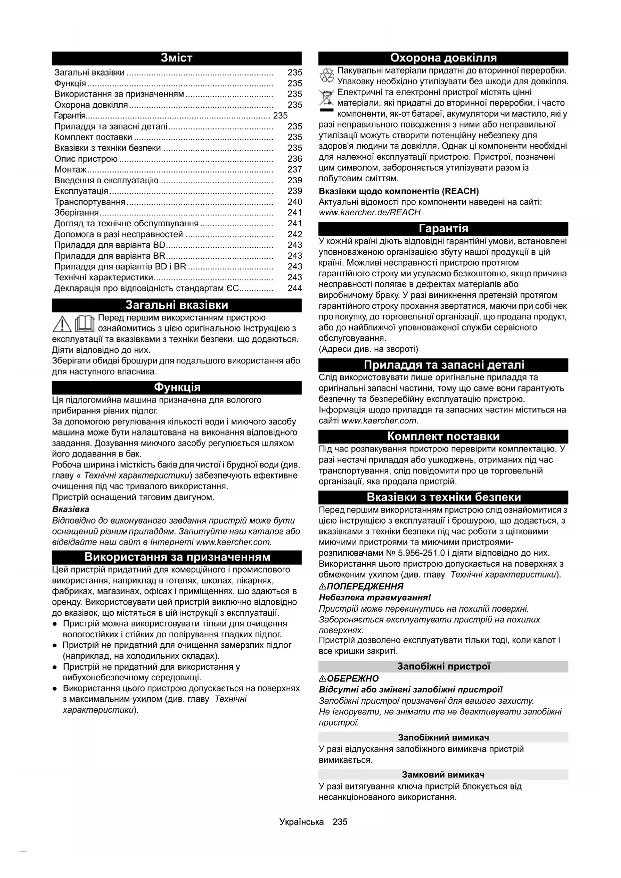 У кожній країні діють відповідні гарантійні умови, встановлені уповноваженою організацією збуту нашої продукції в цій країні. Можливі несправності пристрою протягом гарантійного строку ми усуваємо безкоштовно, якщо причина несправності полягає в дефектах матеріалів або виробничому браку. У разі виникнення претензій протягом гарантійного строку прохання звертатися, маючи при собі чек про покупку, до торговельної організації, що продала продукт, або до найближчої уповноваженої служби сервісного обслуговування. (Адреси див. на звороті) Приладдя та запасні деталі Слід використовувати лише оригінальне приладдя та оригінальні запасні частини, тому що саме вони гарантують безпечну та безперебійну експлуатацію пристрою. Інформація щодо приладдя та запасних частин міститься на сайті www.kaercher.com. Комплект поставки Під час розпакування пристрою перевірити комплектацію. У разі нестачі приладдя або ушкоджень, отриманих під час транспортування, слід повідомити про це торговельній організації, яка продала пристрій. Вказівки з техніки безпеки Перед першим використанням пристрою слід ознайомитися з цією інструкцією з експлуатації і брошурою, що додається, з вказівками з техніки безпеки під час роботи з щітковими миючими пристроями та миючими пристроями- розпилювачами № 5.956-251.0 і діяти відповідно до них. Використання цього пристрою допускається на поверхнях з обмеженим ухилом (див. главу Технічні характеристики). 몇 ПОПЕРЕДЖЕННЯ Небезпека травмування! Пристрій може перекинутись на похилій поверхні. Забороняється експлуатувати пристрій на похилих