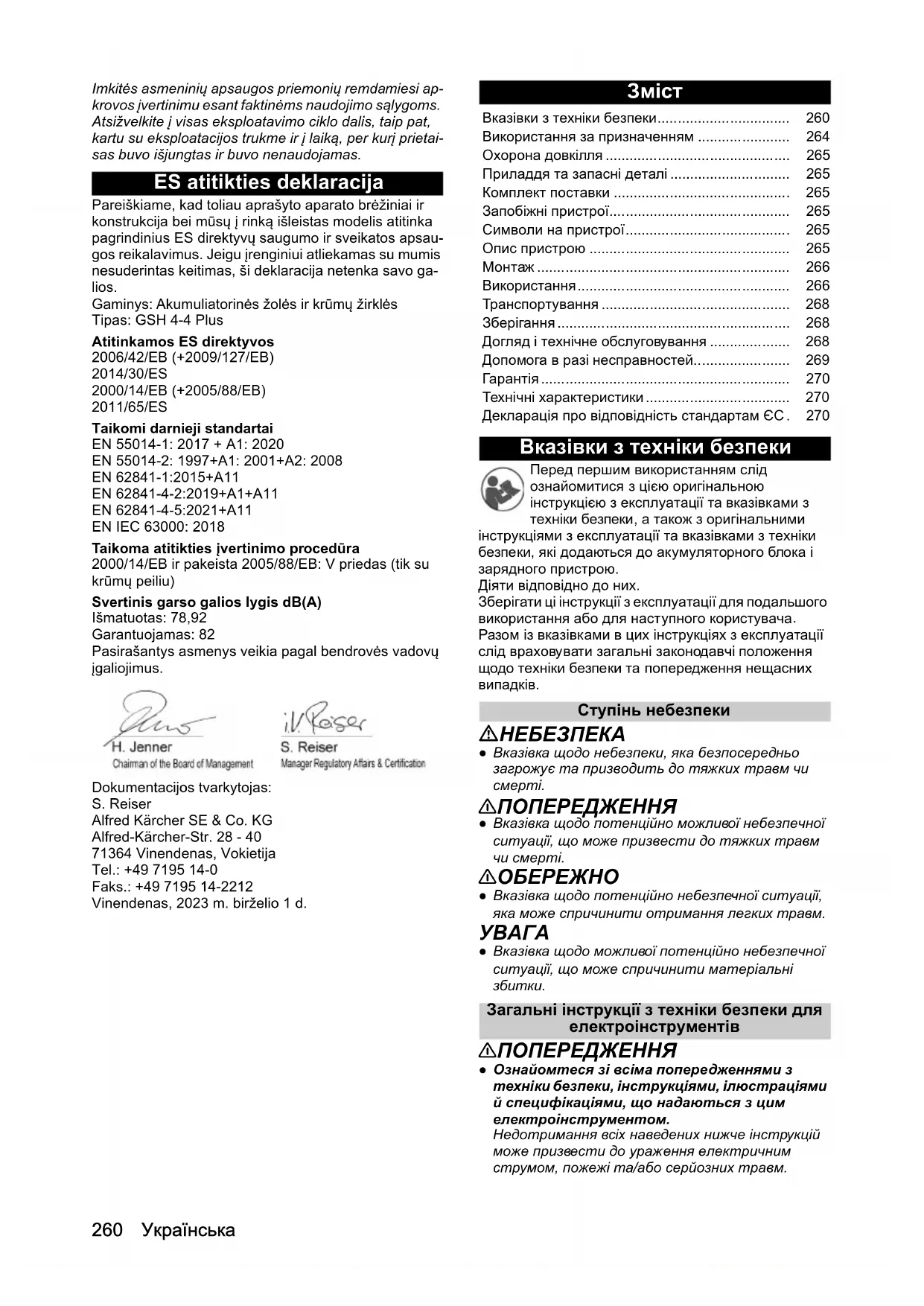 У кожній країні діють відповідні гарантійні умови, встановлені уповноваженою організацією збуту нашої продукції в цій країні. Можливі несправності пристрою протягом гарантійного строку ми усуваємо безкоштовно, якщо причина несправності полягає в дефектах матеріалів або виробничому браку. У разі виникнення претензій протягом гарантійного строку прохання звертатися, маючи при собі чек про покупку, до торговельної організації, що продала продукт, або до найближчої уповноваженої служби сервісного обслуговування. (Адреси див. на звороті) Технічні характеристики Зберігається право на внесення технічних змін. Значення вібрації 몇 ПОПЕРЕДЖЕННЯ Зазначене значення вібрації виміряне за допомогою стандартного методу випробування і може використовуватися для порівняння з пристроєм. Зазначене значення вібрації може бути використано у попередній оцінці навантаження. Залежно від способу використання пристрою, рівень вібрації під час поточного використання пристрою може відрізнятися від зазначеного загального значення. Визначити заходи самозахисту на основі оцінки навантаження в реальних умовах використання. Враховувати всі частини робочого циклу, тобто, наприклад, поряд з часом роботи також час, коли пристрій вимкнено та не працює. Декларація про відповідність стандартам ЄС Цим ми повідомляємо, що нижче зазначена машина на основі своєї конструкції та конструктивного виконання, а також у випущеної у продаж моделі, відповідає спеціальним основним вимогам щодо безпеки та захисту здоров'я представлених нижче директив ЄС. У разі внесення неузгоджених із нами змін до машини ця заява втрачає свою чинність. Виріб: Акумуляторні ножиці для трави і кущоріз Тип: GSH 4-4 Plus Відповідні директиви ЄС 2006/42/EG (+2009/127/EG) 2014/30/ЄС 2000/14/ЄС (+2005/88/ЄС) 2011/65/ЄС Застосовувані гармонізовані стандарти EN 55014-1: 2017 + A1: 2020 EN 55014-2: 1997+A1: 2001+A2: 2008 EN 62841-1:2015+A11 EN 62841-4-2:2019+A1+A11 EN 62841-4-5:2021+A11 EN IEC 63000: 2018 Усі світлодіоди блимають 5 x кожні 2 с. Активована функція температурного захисту акумуляторного блока. 1 Відпустити кнопку УВІМК./ВИМК. і вийняти акумуляторний блок із пристрою, див. главу Знімання акумуляторного блоку. 2 Дати пристрою та акумуляторному блоку охолонути/нагрітися. Використовуйте та зберігайте пристрій і акумуляторний блок тільки в передбаченому температурному діапазоні, див. інструкцію з експлуатації акумуляторного блока. 3 Якщо несправність зберігається, звернутися до місцевого дилера або до авторизованої сервісної