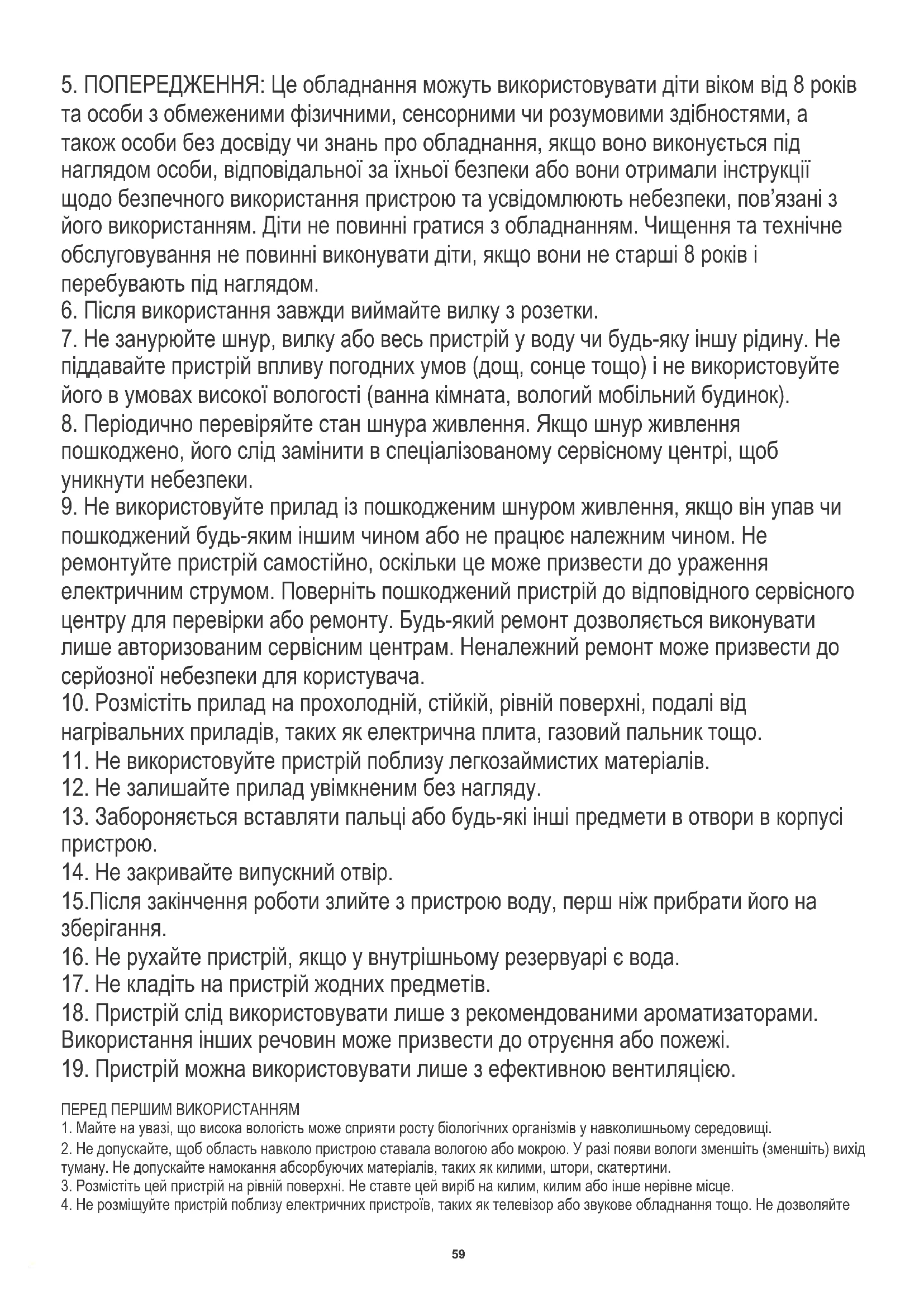 ВИРІШЕННЯ ПРОБЛЕМ Якщо цей продукт не працює належним чином, виконайте наведені нижче дії для самостійного усунення несправностей, перш ніж відправити повернення продавцю: ПРОБЛЕМА 1. Виріб автоматично вимикається через одну секунду після ввімкнення. МОЖЛИВА ПРИЧИНА: Недостатня кількість води.61 РІШЕННЯ: Будь ласка, додайте воду в резервуар для води.МОЖЛИВА ПРИЧИНА: адаптер живлення не підключено до пристрою.РІШЕННЯ: переконайтеся, що адаптер живлення підключено до продукту. Щоб перевірити успішність з’єднання, вийміть кабель із гнізда micro-USB і під’єднайте його зновуПРОБЛЕМА 2: Немає спрею або ненормальний спрейМОЖЛИВА ПРИЧИНА: Недостатня кількість води.РІШЕННЯ: Будь ласка, додайте воду в резервуар для води, якщо її недостатньо. Якщо рівень води в резервуарі для води вищий за позначку максимального рівня води, туман розпорошуватиметься нерівномірно, ненормально. Злийте воду так, щоб вона була нижче рівня «MAX».МОЖЛИВА ПРИЧИНА: мікросхема ультразвукового розпилювача (I) забруднена. РІШЕННЯ: очистіть резервуар для води (C) і мікросхему (I). Масло іноді накопичується на плиті з ультразвуковим розпиленням. МОЖЛИВА ПРИЧИНА: Нижні впускні отвори (H) запилені.РІШЕННЯ: Якщо отвори для впуску повітря (G) запилені, об’єм повітря, що всмоктується, значно зменшиться, а імпульсу повітря буде недостатньо для розпилення туману. Очистіть повітрозабірник.ПРОБЛЕМА 3: ВитікМОЖЛИВА ПРИЧИНА: Кришка (B) не закрита належним чином.РІШЕННЯ: надійно закрийте кришку.МОЖЛИВА ПРИЧИНА: Температура в приміщенні занадто низька або вологість занадто висока.РІШЕННЯ: якщо температура або вологість робочого середовища занадто низька або занадто висока, туман і краплі води будуть накопичуватися на поверхні пристрою. Вимкніть пристрій.ЧИЩЕННЯ ТА ОБСЛУГОВУВАННЯБудь ласка, очищуйте пристрій відповідно до наведених нижче кроків після кожного використання:1. Під час очищення від’єднайте пристрій від джерела живлення.2. Відкрийте верхню кришку (B), вилийте всю воду, що залишилася, з резервуара для води, обережно струшуючи пристрій. Вилийте будь-яку воду, що залишилася, з «СТОРОНИ ЗЛИВУ» резервуара для води - (МАЛ. 7)3. Розведіть трохи нейтрального кухонного мийного засобу в теплій воді, потім протріть прилад тканиною.4. Якщо ви помітили забруднення всередині отвору для випуску повітря (D), зніміть верхню кришку (B) і очистіть її.5. Будь ласка, не використовуйте медичний розчинник фенілетанол для обслуговування, інакше продукт може бути пошкоджений. 6. Якщо він не використовується протягом тривалого часу, вилийте залишки води з резервуара для води (C) і зберігайте його в сухому та прохолодному місці після очищення.Технічні дані:Блок живлення: micro USB 5V 1A (5W)Об'єм резервуара для води: 70 млПродуктивність туману: 7-15 мл/годЧастота ультразвуку: 3,0 МГц У інтересах навколишнього середовища.Будь ласка, віддайте картонну упаковку в місце збору мукулатури. Політиленові мішки (PE) викинути в смітник для пластику. Відпрацьований пристрій повинен бути відправлений у відповідну точку зберігання, тому що в пристрої є небезпечні інгредієнти, які можуть становити загрозу навколишньому середовищу. Електричний пристрій потрібно повернути так, щоб обмежити його повторне використання. Якщо у пристрої є батерейки, то потрібно їх витягнути і віддати до відповідного пунтку.