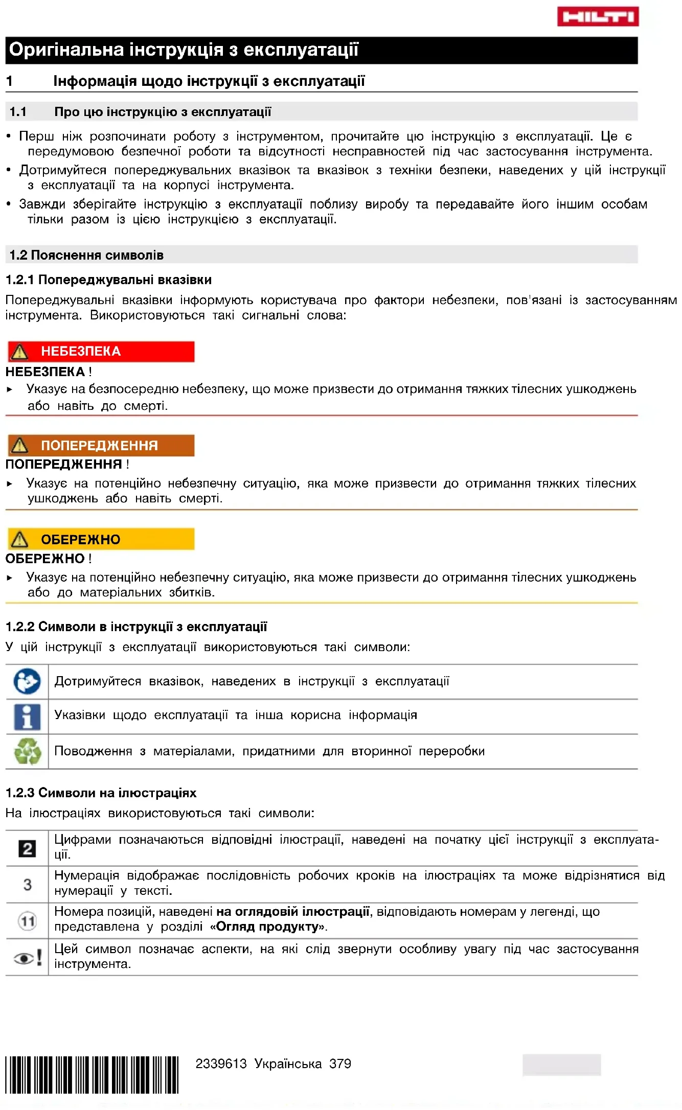 Занадто малі опори для рук, м'які підкладки та/або ремені ▶ Зверніться до сервісної слу- жби компанії Hilti. Ремінь опори для руки прилягає занадто щільно. ▶ Відрегулюйте ремінь опори для руки таким чином, щоб він щільно прилягав, однак при цьому не стискав плече занадто сильно. → стор. 383 12 Утилізація Більшість матеріалів, з яких виготовлено інструменти компанії Hilti, придатні для вторинної пере- робки. Передумовою для їхньої вторинної переробки є належне сортування відходів за типом ма- теріалу. У багатьох країнах світу компанія Hilti приймає старі інструменти для їхньої утилізації. Щоб отримати додаткову інформацію з цього питання, звертайтеся до сервісної служби компанії Hilti або до свого торгового консультанта. 13 Гарантійні зобов'язання виробника ▶ З питань гарантії, будь ласка, звертайтеся до найближчого партнера компанії Hilti. 14 Додаткова інформація Щоб ознайомитися із додатковою інформацією про застосування й технічне обслуговування виробу, його вплив на навколишнє середовище, а також про його утилізацію, будь ласка, скористайтеся цим посиланням: qr.hilti.com/manual/?id=2339613 Це посилання також наведене наприкінці документа у вигляді QR-коду. Түпнұсқа пайдалану бойынша нұсқаулық 1 Пайдалану бойынша нұсқаулық туралы мәліметтер