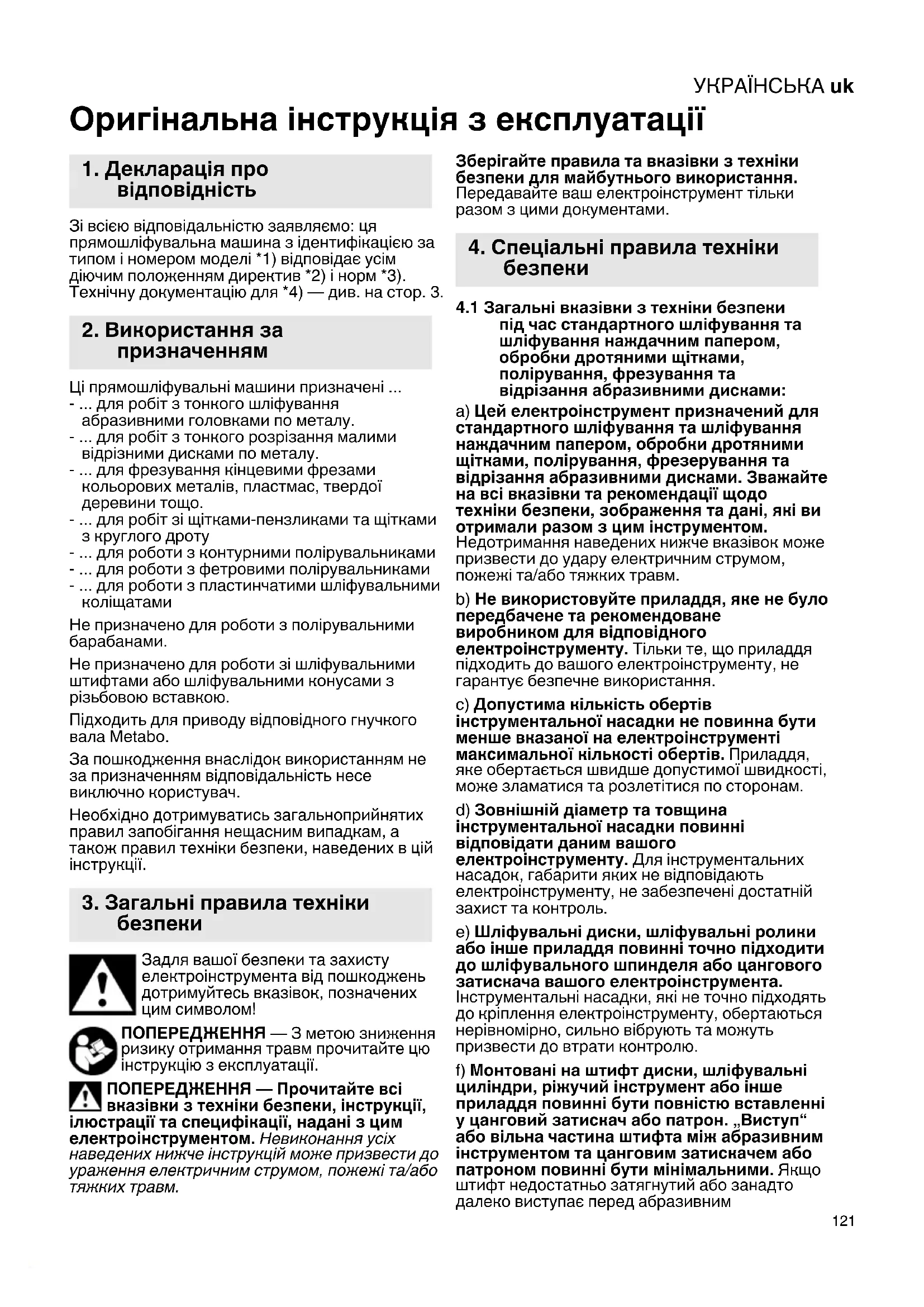 Не призначено для роботи з полірувальними барабанами. Не призначено для роботи зі шліфувальними штифтами або шліфувальними конусами з різьбовою вставкою. Підходить для приводу відповідного гнучкого вала Metabo. За пошкодження внаслідок використанням не за призначенням відповідальність несе виключно користувач. Необхідно дотримуватись загальноприйнятих правил запобігання нещасним випадкам, а також правил техніки безпеки, наведених в цій інструкції. Задля вашої безпеки та захисту електроінструмента від пошкоджень дотримуйтесь вказівок, позначених цим символом! ПОПЕРЕДЖЕННЯ — З метою зниження ризику отримання травм прочитайте цю інструкцію з експлуатації. ПОПЕРЕДЖЕННЯ — Прочитайте всі вказівки з техніки безпеки, інструкції, ілюстрації та специфікації, надані з цим електроінструментом. Невиконання усіх наведених нижче інструкцій може призвести до ураження електричним струмом, пожежі та/або тяжких травм. Зберігайте правила та вказівки з техніки безпеки для майбутнього використання. Передавайте ваш електроінструмент тільки разом з цими документами.