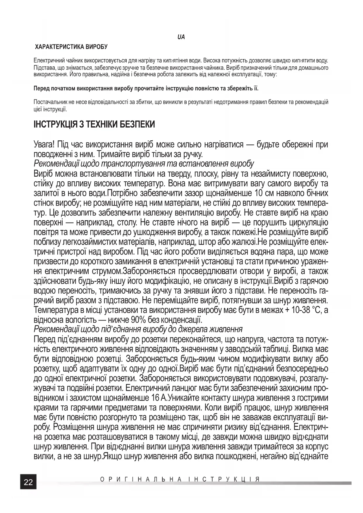 ХАРАКТЕРИСТИКА ВИРОБУ Електричний чайник використовується для нагріву та кип›ятіння води. Висока потужність дозволяє швидко кип›ятити воду. Підстава, що знімається, забезпечує зручне та безпечне використання чайника. Виріб призначений тільки для домашнього використання. Його правильна, надійна і безпечна робота залежить від належної експлуатації, тому: Перед початком використання виробу прочитайте інструкцію повністю та збережіть її. Постачальник не несе відповідальності за збитки, що виникли в результаті недотримання правил безпеки та рекомендацій цієї інструкції. ІНСТРУКЦІЯ З ТЕХНІКИ БЕЗПЕКИ Увага! Під час використання виріб може сильно нагріватися — будьте обережні при поводженні з ним. Тримайте виріб тільки за ручку. Рекомендації щодо транспортування та встановлення виробу Виріб можна встановлювати тільки на тверду, плоску, рівну та незаймисту поверхню, стійку до впливу високих температур. Вона має витримувати вагу самого виробу та залитої в нього води.Потрібно забезпечити зазор щонайменше 10 см навколо бічних стінок виробу; не розміщуйте над ним матеріали, не стійкі до впливу високих темпера- тур. Це дозволить забезпечити належну вентиляцію виробу. Не ставте виріб на краю поверхні — наприклад, столу. Не ставте нічого на виріб — це порушить циркуляцію повітря та може привести до ушкодження виробу, а також пожежі.Не розміщуйте виріб поблизу легкозаймистих матеріалів, наприклад, штор або жалюзі.Не розміщуйте елек- тричні пристрої над виробом. Під час його роботи виділяється водяна пара, що може призвести до короткого замикання в електричній установці та стати причиною уражен- ня електричним струмом.Забороняється просвердлювати отвори у виробі, а також здійснювати будь-яку іншу його модифікацію, не описану в інструкції.Виріб з гарячою водою переносіть, тримаючись за ручку та знявши його з підстави. Не переносіть га- рячий виріб разом з підставою. Не переміщайте виріб, потягнувши за шнур живлення. Температура в місці установки та використання виробу має бути в межах + 10-38 °C, а відносна вологість — нижче 90% без конденсації. Рекомендації щодо під’єднання виробу до джерела живлення Перед під’єднанням виробу до розетки переконайтеся, що напруга, частота та потуж- ність електричного живлення відповідають значенням у заводській таблиці. Вилка має бути відповідною розетці. Забороняється будь-яким чином модифікувати вилку або розетку, щоб адаптувати їх одну до одної.Виріб має бути під’єднаний безпосередньо до одної електричної розетки. Забороняється використовувати подовжувачі, розгалу- жувачі та подвійні розетки. Електричний ланцюг має бути забезпечений захисним про- відником і захистом щонайменше 16 A.Уникайте контакту шнура живлення з гострими краями та гарячими предметами та поверхнями. Коли виріб працює, шнур живлення має бути повністю розгорнуто та розміщено так, щоб він не заважав експлуатації ви- робу. Розміщення шнура живлення не має спричиняти ризику від’єднання. Електрич- на розетка має розташовуватися в такому місці, де завжди можна швидко від›єднати шнур живлення. При від›єднанні вилки шнура живлення завжди тримайтеся за корпус вилки, а не за шнур.Якщо шнур живлення або вилка пошкоджені, негайно від’єднайте23 ОРИГІНАЛЬНА ІНСТРУКЦІЯ