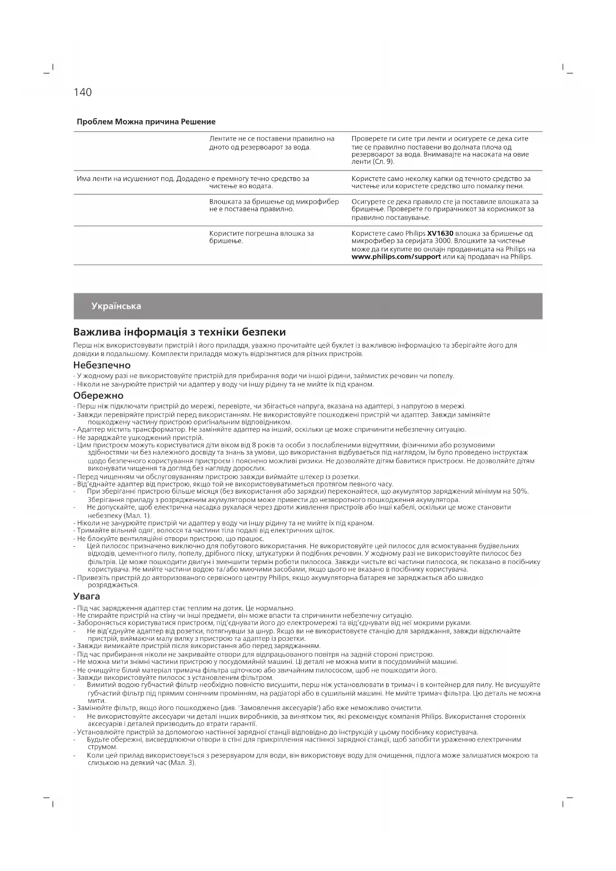 Перевірте, чи накладку для вологого прибирання встановлено належним чином. Правильне розміщення див. в посібнику користувача. Резервуар для води порожній або майже порожній. Наповніть резервуар для води.145 Проблема Можлива причина Рішення Використовується накладка для вологого прибирання, яка не постачається компанією Philips. Використовуйте лише оригінальну накладку Philips для вологого прибирання. Ці накладки для вологого прибирання можна придбати в інтернет-магазині Philips за адресою www.philips.com/support або у дилера Philips. З резервуара надто швидко витікає забагато води. Кришка резервуара для води не прикріплена належним чином. Перевірте заглушку та переконайтеся, що вона ціла й належним чином закрита. Стрічки на дні резервуара для води не встановлено належним чином. Перевірте всі три стрічки та переконайтеся, що їх встановлено належним чином на нижній панелі резервуара для води. Крім того, зверніть увагу на напрям, в якому розташовано стрічки (Мал. 9). Після вологого прибирання на підлозі лишаються розводи. У воду додано забагато рідкого засобу для чищення. Додавайте лише кілька крапель рідкого засобу для чищення або використовуйте засіб, що менше піниться. Накладку для вологого прибирання встановлено неправильно. Перевірте, чи накладку для вологого прибирання встановлено належним чином. Правильне розміщення див. в посібнику користувача. Використовується невідповідна накладка для вологого прибирання. Використовуйте лише засіб Philips XV1630 накладка для вологого прибирання серії 3000 Series. Ці накладки для вологого прибирання можна придбати в інтернет- магазині Philips за адресою www.philips.com/support або у дилера Philips.2023 © Versuni Holding B.V. PHILIPS and the Philips Shield Emblem are registered trademarks of Koninklijke Philips N.V. and are used under license. This product has been manufactured by and is sold under the responsibility of Versuni Holding B.V., and Versuni Holding B.V. is the warrantor in relation to this product. 3000.111.3293.1 (06/2023) >75 % recycled paper >75 % papier recyclé