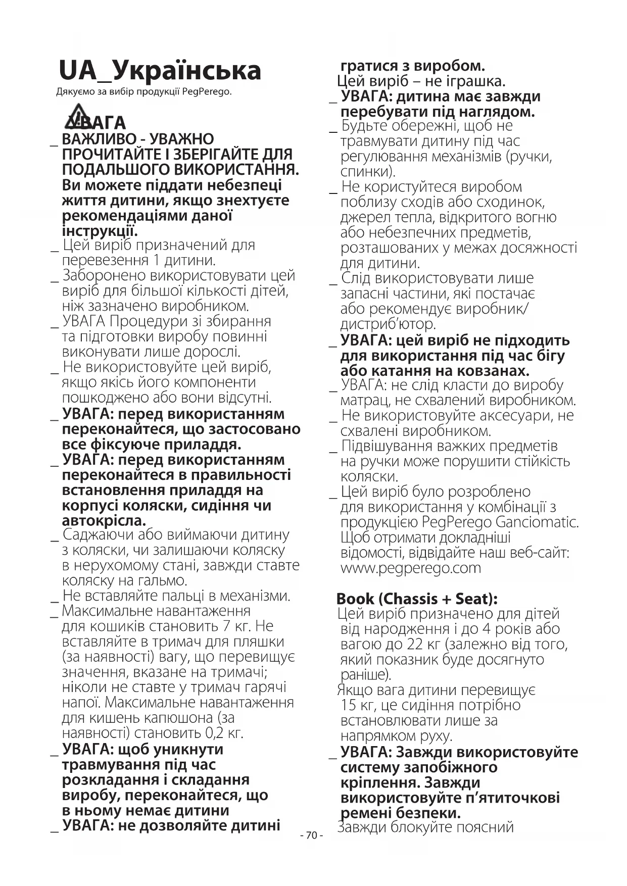 _ Цей виріб було розроблено для використання у комбінації з продукцією PegPerego Ganciomatic. Щоб отримати докладніші відомості, відвідайте наш веб-сайт: www.pegperego.com Book (Chassis + Seat): Цей виріб призначено для дітей від народження і до 4 років або вагою до 22 кг (залежно від того, який показник буде досягнуто