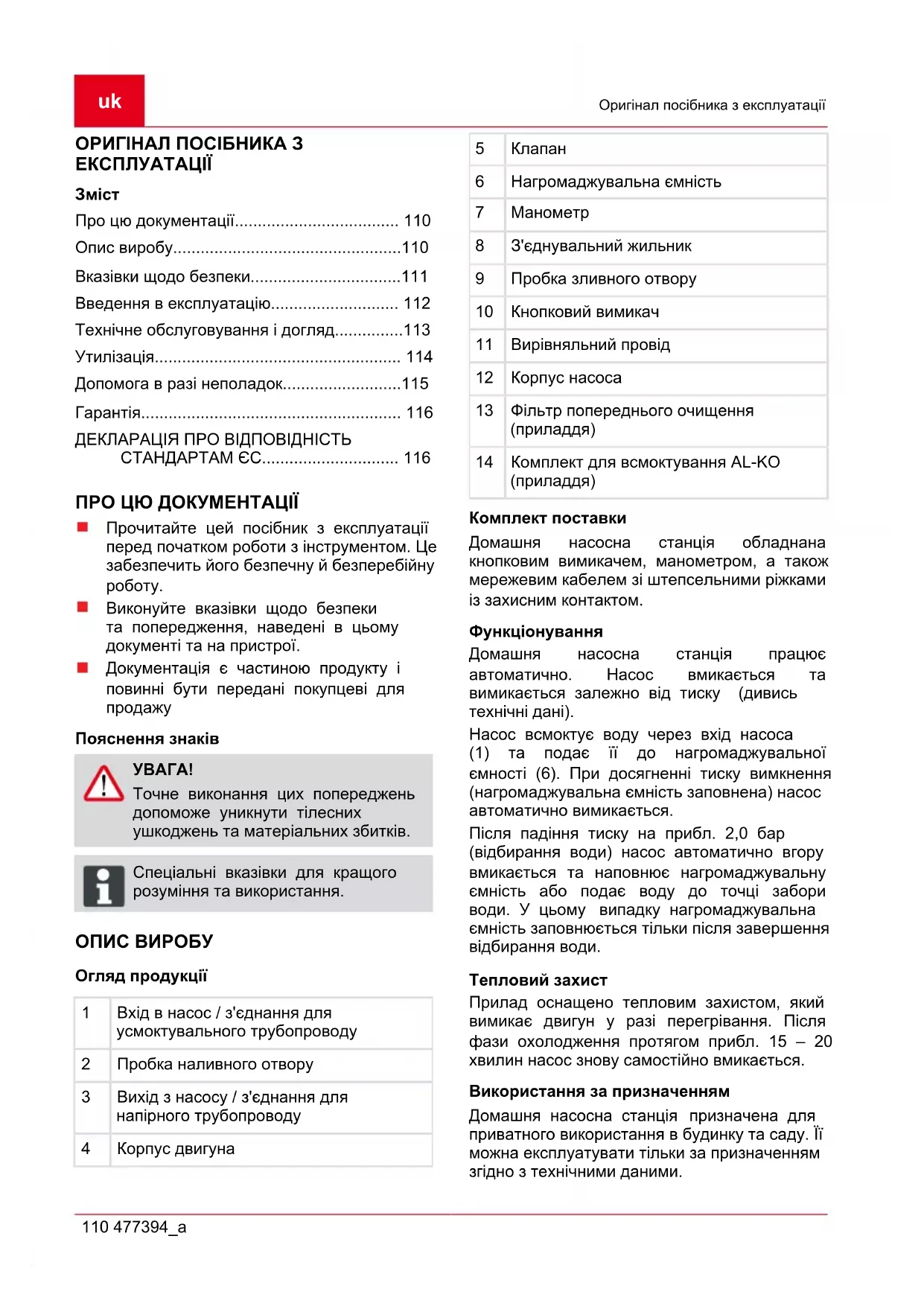 Комплект поставки Домашня насосна станція обладнана кнопковим вимикачем, манометром, а також мережевим кабелем зі штепсельними ріжками із захисним контактом. Функціонування Домашня насосна станція працює автоматично. Насос вмикається та вимикається залежно від тиску (дивись технічні дані). Насос всмоктує воду через вхід насоса (1) та подає її до нагромаджувальної ємності (6). При досягненні тиску вимкнення (нагромаджувальна ємність заповнена) насос автоматично вимикається. Після падіння тиску на прибл. 2,0 бар (відбирання води) насос автоматично вгору вмикається та наповнює нагромаджувальну ємність або подає воду до точці забори води. У цьому випадку нагромаджувальна ємність заповнюється тільки після завершення відбирання води. Тепловий захист Прилад оснащено тепловим захистом, який вимикає двигун у разі перегрівання. Після фази охолодження протягом прибл. 15 – 20 хвилин насос знову самостійно вмикається. Використання за призначенням Домашня насосна станція призначена для приватного використання в будинку та саду. Її можна експлуатувати тільки за призначенням згідно з технічними даними.Опис виробу 477394_a 111 Прилад призначений виключно для наступних