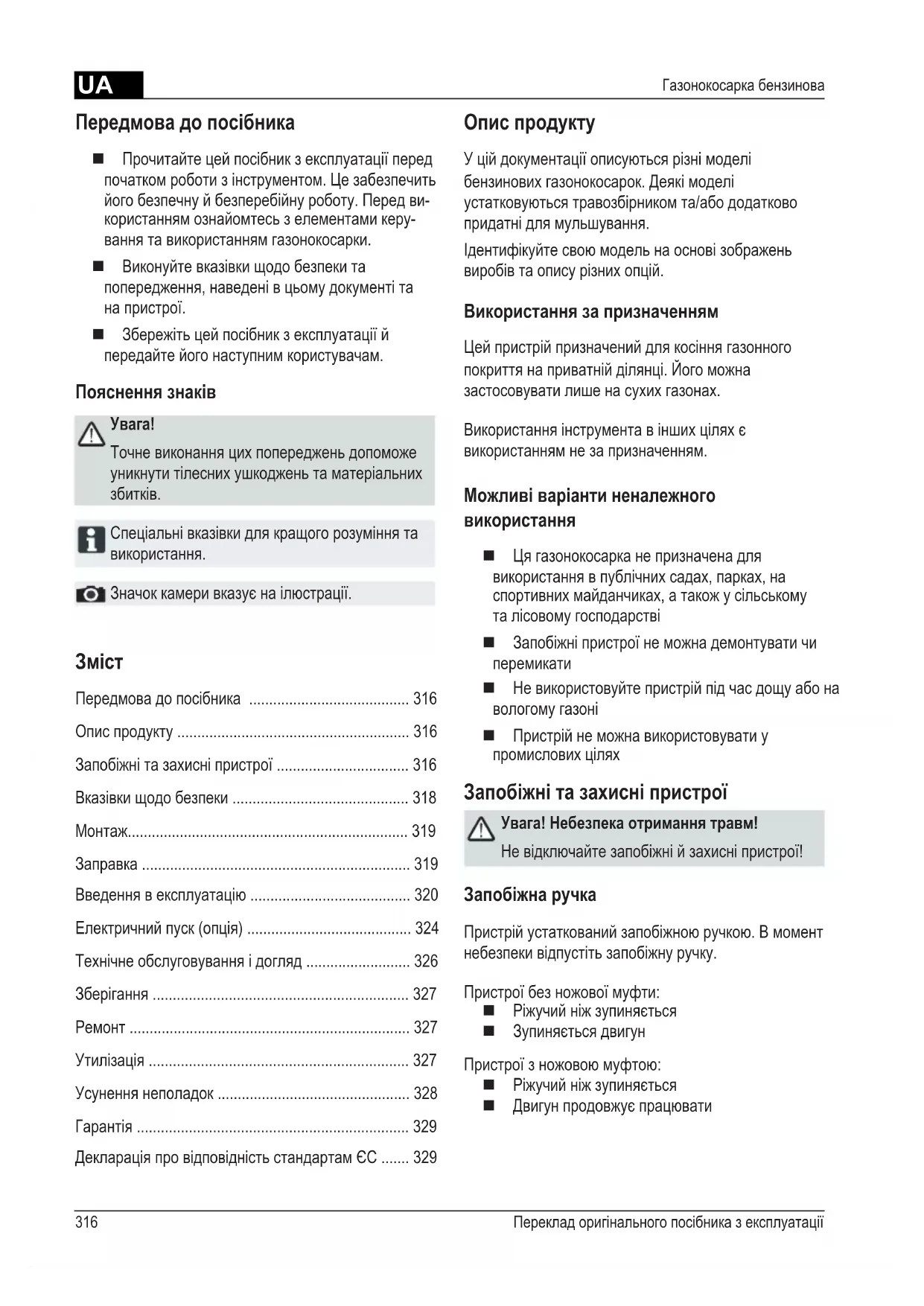 - Декларація про відповідність стандартам ЄС Передмова до посібника Прочитайте цей посібник з експлуатації перед початком роботи з інструментом. Це забезпечить його безпечну й безперебійну роботу. Перед ви- користанням ознайомтесь з елементами керу- вання та використанням газонокосарки. Виконуйте вказівки щодо безпеки та попередження, наведені в цьому документі та на пристрої. Збережіть цей посібник з експлуатації й передайте його наступним користувачам. Пояснення знаків p. 329