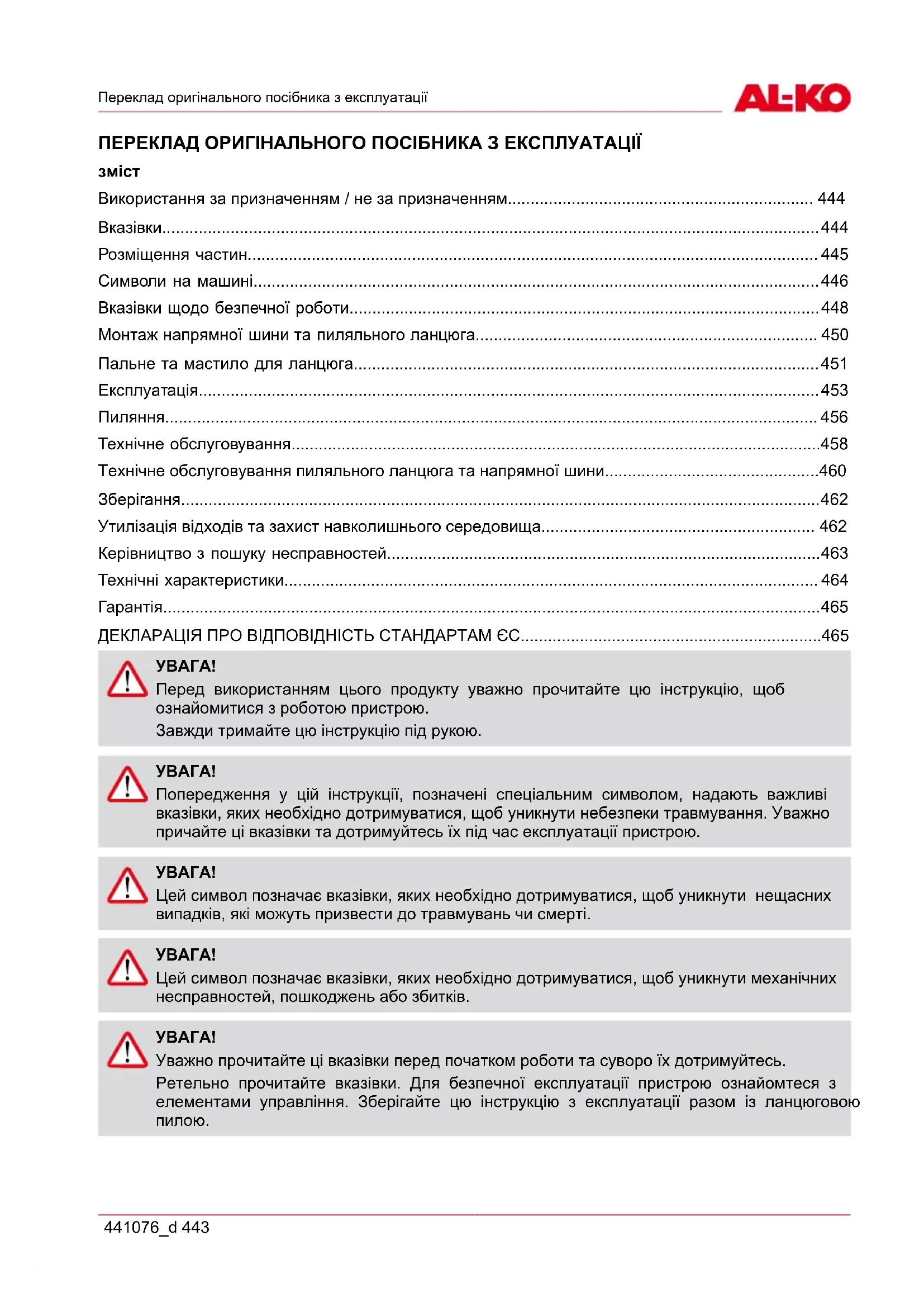 Intertek Deutschland GmbH Stangenstr. 1 D-70771 Leinfelden-Echterdingen Nr. 0905 Intertek Deutschland GmbH Stangenstr. 1 70771 Leinfelden-Echterdingen Nr. 0905 Wolfgang Hergeth Managing DirectorПереклад оригінального посібника з експлуатації 441076_d 443 ПЕРЕКЛАД ОРИГІНАЛЬНОГО ПОСІБНИКА З ЕКСПЛУАТАЦІЇ
