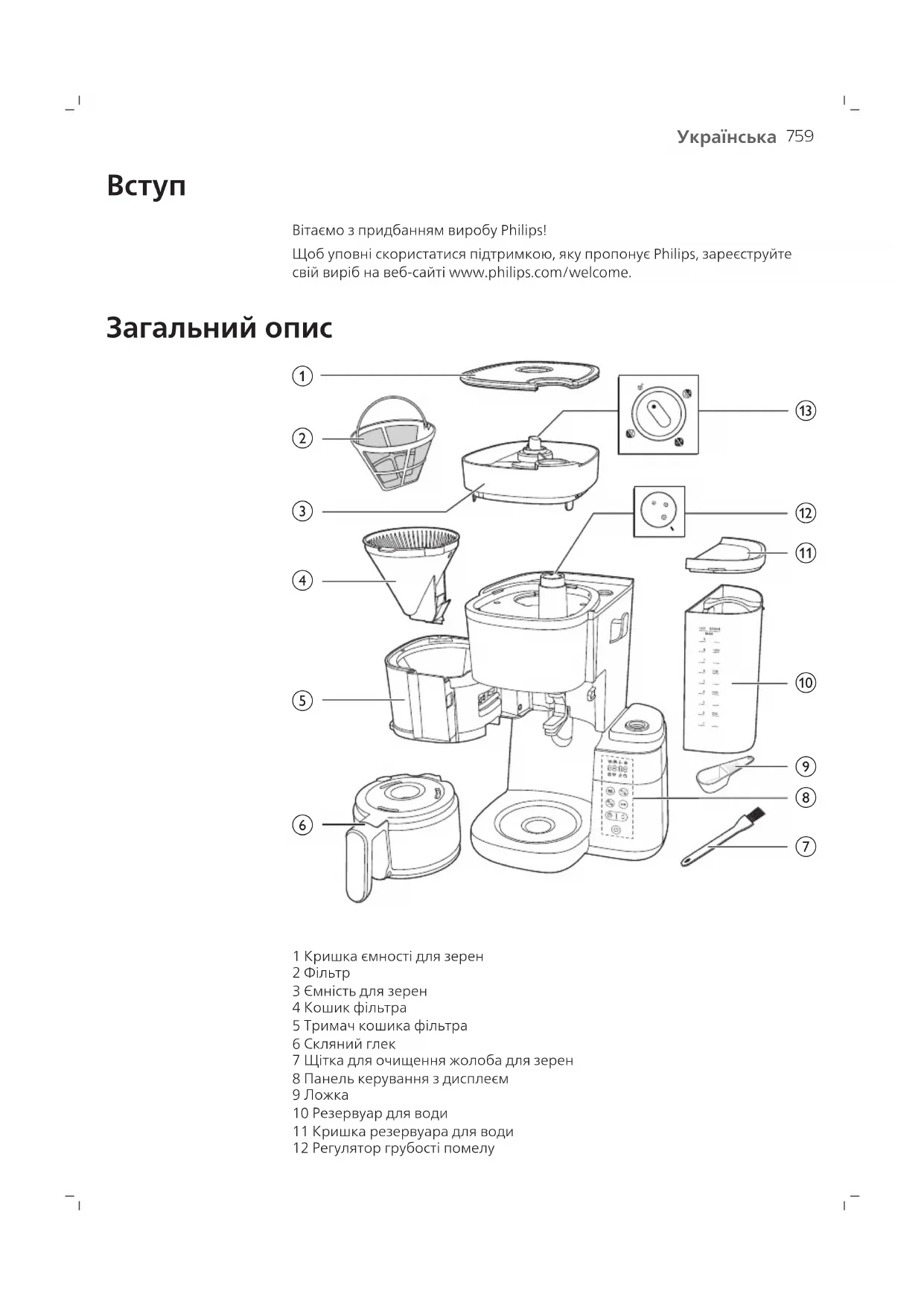 1 Кришка ємності для зерен 2 Фільтр 3 Ємність для зерен 4 Кошик фільтра 5 Тримач кошика фільтра 6 Скляний глек 7 Щітка для очищення жолоба для зерен 8 Панель керування з дисплеєм 9 Ложка 10 Резервуар для води 11 Кришка резервуара для води 12 Регулятор грубості помелу760