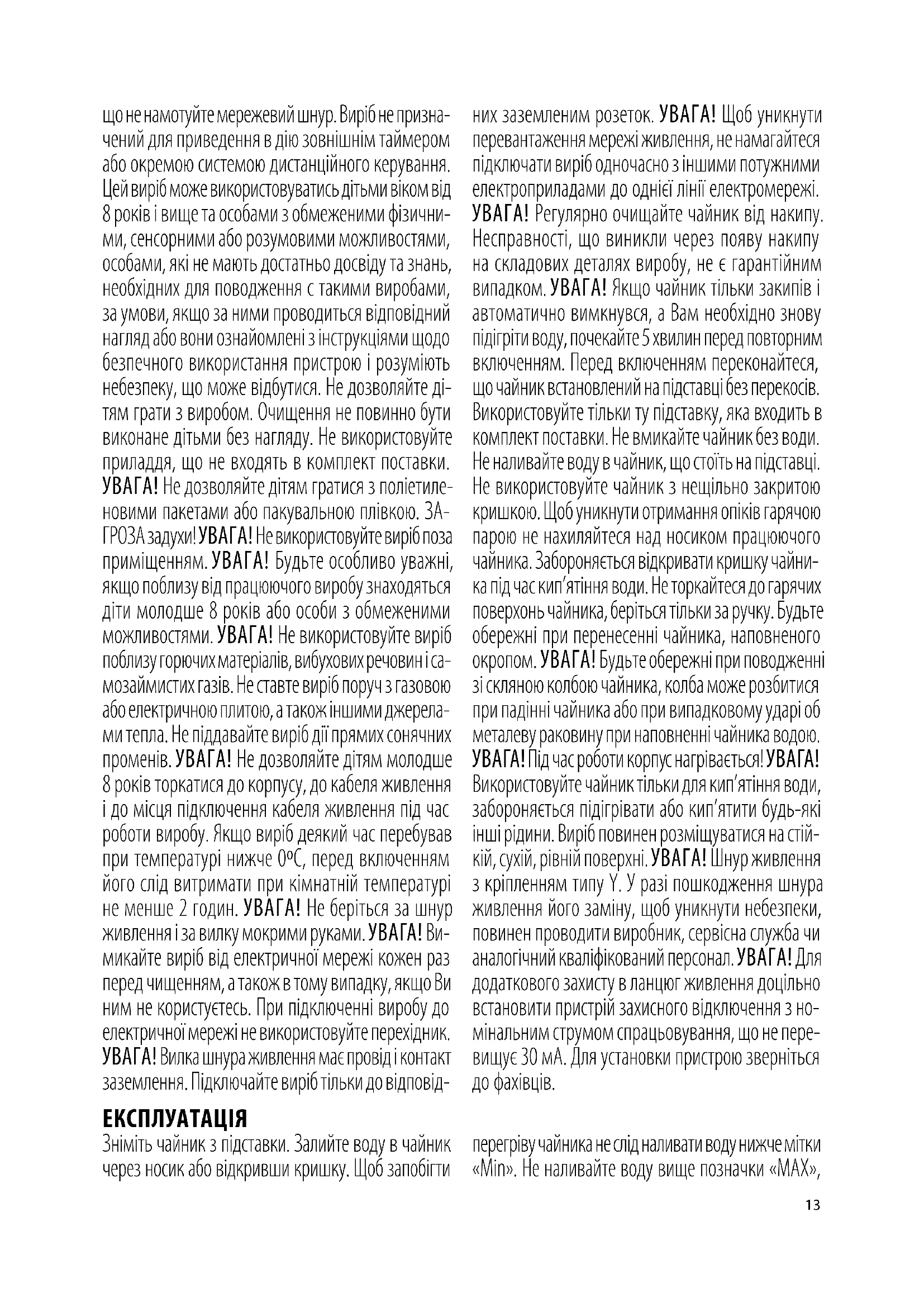 Перед хранением убедитесь, что изделие отключено от электросети. Выполните все требования раздела ОЧИСТКА И УХОД. Храните изделие в сухом, прохладном и недоступном для детей месте. ЗАХОДИ БЕЗПЕКИ Уважно прочитайте цю інструкцію перед експлу- атацією виробу, щоб уникнути поломок при ви- користанні. Перед включенням виробу перевірте, чи відповідають технічні характеристики виробу, позначені на наклейці, параметрам електроме- режі. Неправильне використання може призвести до поломки виробу, завдати матеріальної шкоди або заподіяти шкоду здоров’ю користувача. Вико- ристовувати тільки в побутових цілях згідно з цим Керівництвом по експлуатації. Виріб не призначений для комерційного застосування. Використовуйте виріб тільки за прямим його призначенням. Не використовуйте виріб в безпосередній близькості від кухонної раковини, на вулиці і в приміщеннях з підвищеною вологістю повітря. Завжди відклю- чайте виріб від електромережі, якщо він не ви- користовується, а також перед чищенням. Виріб не повинен бути без нагляду, поки він підключений до мережі живлення. Слідкуйте, щоб мережевий шнур не торкався гострих кромок меблів і гарячих по- верхонь. Щоб уникнути ураження електрострумом не намагайтеся самостійно розбирати і ремонтувати виріб. При відключенні виробу не тягніть за шнур живлення, беріться за вилку. Не перекручуйте і ні на UKR13 що не намотуйте мережевий шнур. Виріб не призна- чений для приведення в дію зовнішнім таймером або окремою системою дистанційного керування. Цей виріб може використовуватись дітьми віком від 8 років і вище та особами з обмеженими фізични- ми, сенсорними або розумовими можливостями, особами, які не мають достатньо досвіду та знань, необхідних для поводження с такими виробами, за умови, якщо за ними проводиться відповідний нагляд або вони ознайомлені з інструкціями щодо безпечного використання пристрою і розуміють небезпеку, що може відбутися. Не дозволяйте ді- тям грати з виробом. Очищення не повинно бути виконане дітьми без нагляду. Не використовуйте приладдя, що не входять в комплект поставки. УВАГА! Не дозволяйте дітям гратися з поліетиле- новими пакетами або пакувальною плівкою. ЗА- ГРОЗА задухи! УВАГА! Не використовуйте виріб поза приміщенням. УВАГА! Будьте особливо уважні, якщо поблизу від працюючого виробу знаходяться діти молодше 8 років або особи з обмеженими можливостями. УВАГА! Не використовуйте виріб поблизу горючих матеріалів, вибухових речовин і са- мозаймистих газів. Не ставте виріб поруч з газовою або електричною плитою, а також іншими джерела- ми тепла. Не піддавайте виріб дії прямих сонячних променів. УВАГА! Не дозволяйте дітям молодше 8 років торкатися до корпусу, до кабеля живлення і до місця підключення кабеля живлення під час роботи виробу. Якщо виріб деякий час перебував при температурі нижче 0ºC, перед включенням його слід витримати при кімнатній температурі не менше 2 годин. УВАГА! Не беріться за шнур живлення і за вилку мокрими руками. УВАГА! Ви- микайте виріб від електричної мережі кожен раз перед чищенням, а також в тому випадку, якщо Ви ним не користуєтесь. При підключенні виробу до електричної мережі не використовуйте перехідник. УВАГА! Вилка шнура живлення має провід і контакт заземлення. Підключайте виріб тільки до відповід- них заземленим розеток. УВАГА! Щоб уникнути п