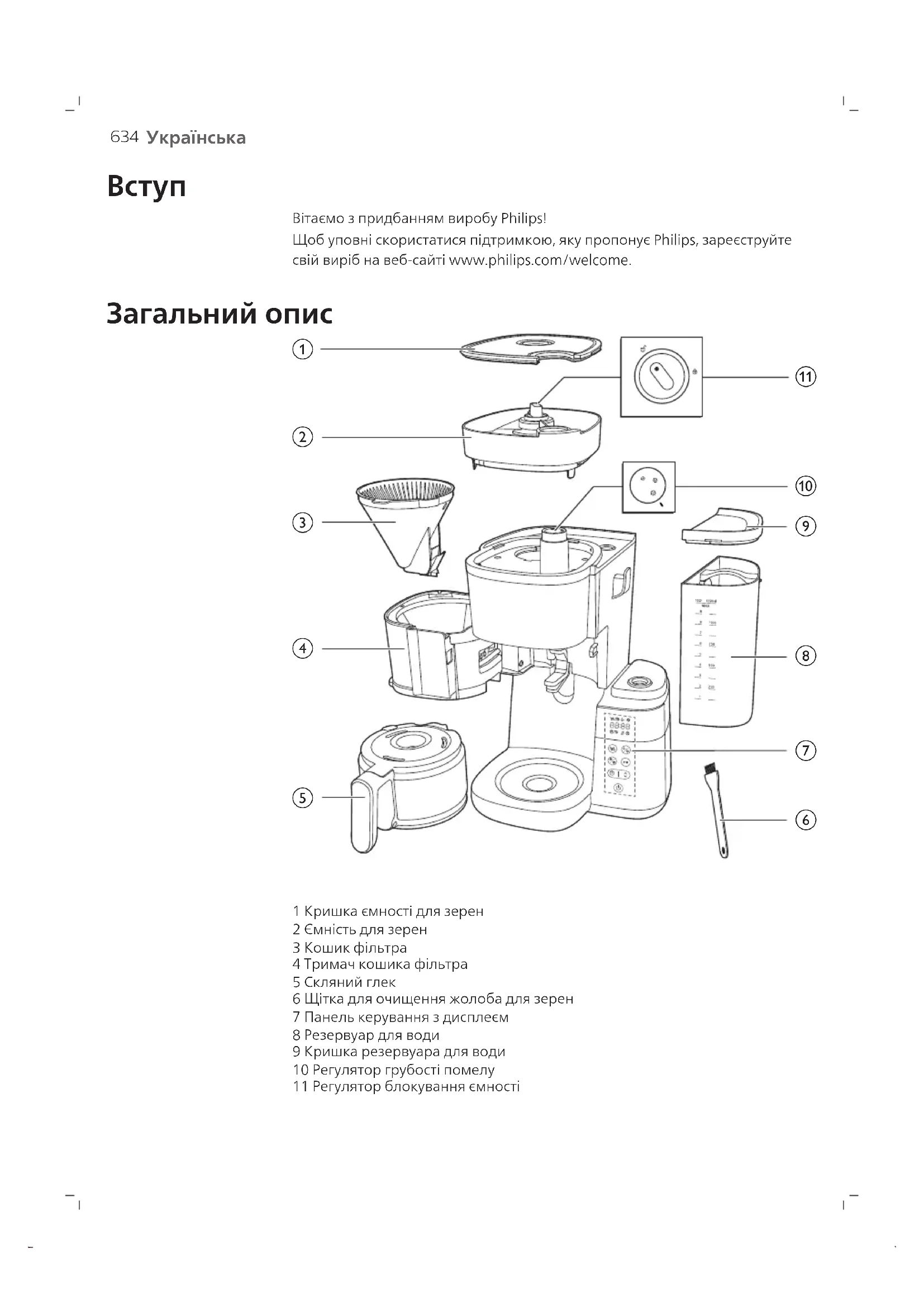 1 Кришка ємності для зерен 2 Ємність для зерен 3 Кошик фільтра 4 Тримач кошика фільтра 5 Скляний глек 6 Щітка для очищення жолоба для зерен 7 Панель керування з дисплеєм 8 Резервуар для води 9 Кришка резервуара для води 10 Регулятор грубості помелу 11 Регулятор блокування ємності635
