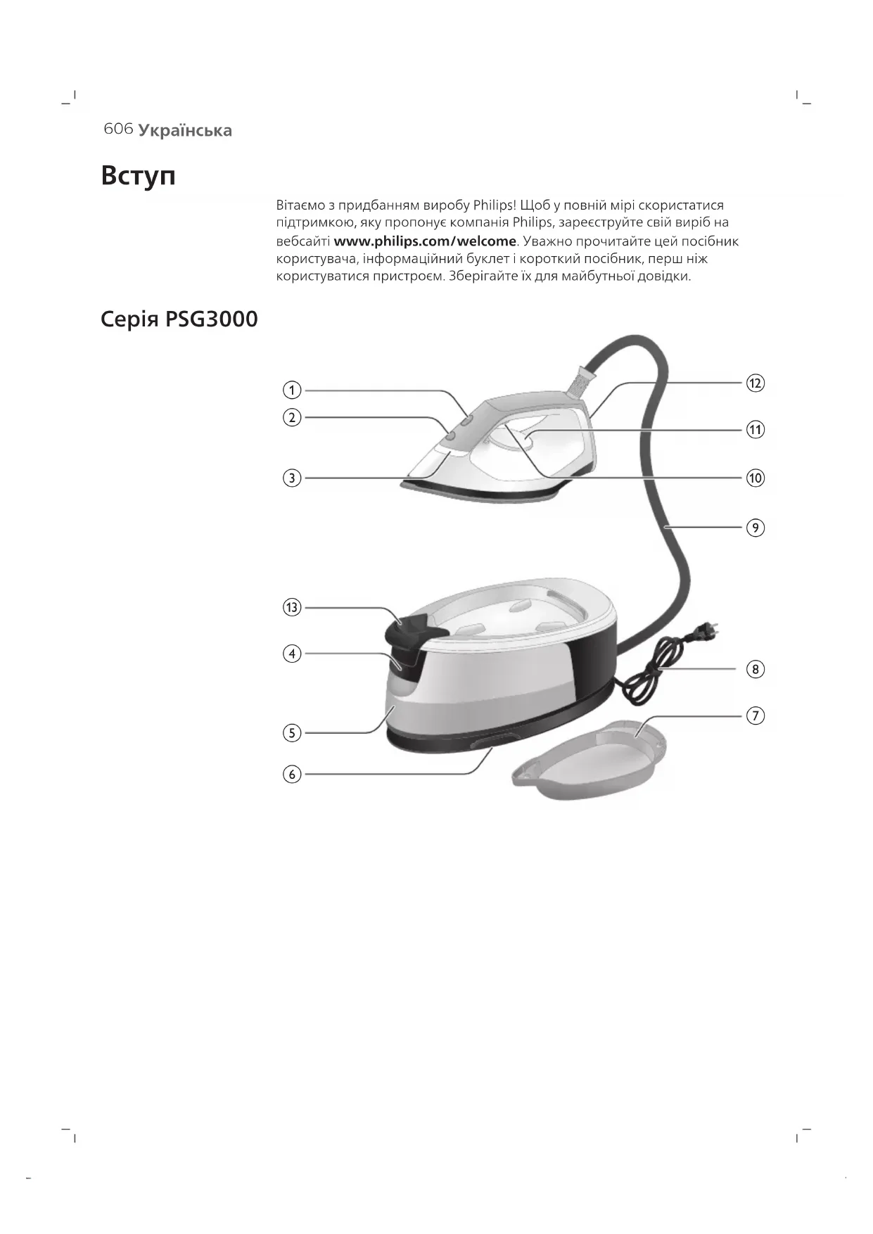 Вітаємо з придбанням виробу Philips! Щоб у повній мірі скористатисяпідтримкою, яку пропонує компанія Philips, зареєструйте свій виріб навебсайті www.philips.com/welcome. Уважно прочитайте цей посібниккористувача, інформаційний буклет і короткий посібник, перш ніжкористуватися пристроєм. Зберігайте їх для майбутньої довідки. Серія PSG3000