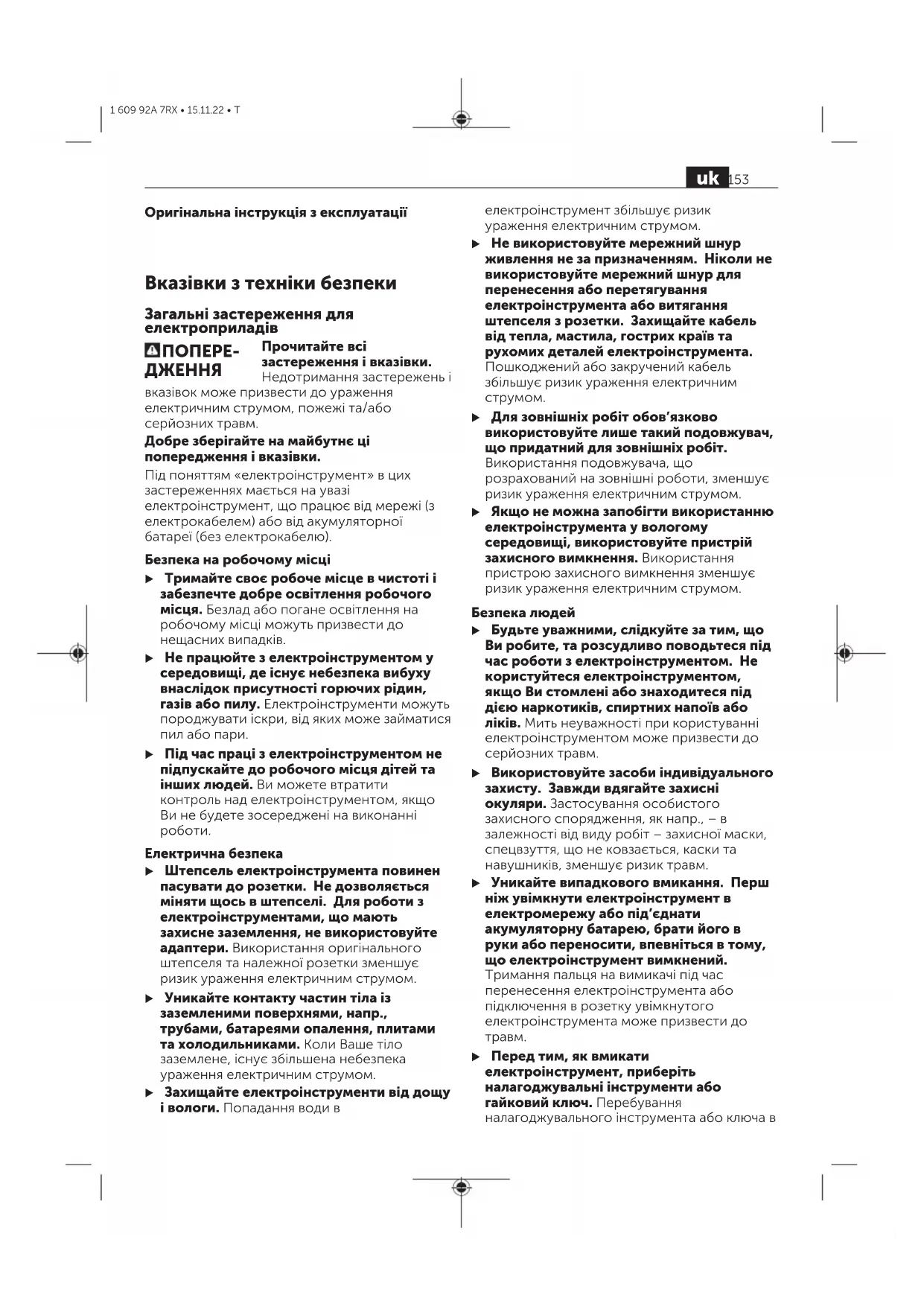 u Перед тим, як вмикати електроінструмент, приберіть налагоджувальні інструменти або гайковий ключ. Перебування налагоджувального інструмента або ключа в uk 153 1 609 92A 7RX • 15.11.22 • Tчастині електроінструмента, що обертається, може призвести до травм. u Уникайте неприродного положення тіла. Завжди зберігайте стійке положення та тримайте рівновагу. Це дозволить Вам краще контролювати електроінструмент у небезпечних ситуаціях. u Вдягайте придатний одяг. Не вдягайте просторий одяг та прикраси. Не підставляйте волосся, одяг та рукавиці до деталей електроінструмента, що рухаються. Просторий одяг, довге волосся та прикраси можуть потрапити в деталі, що