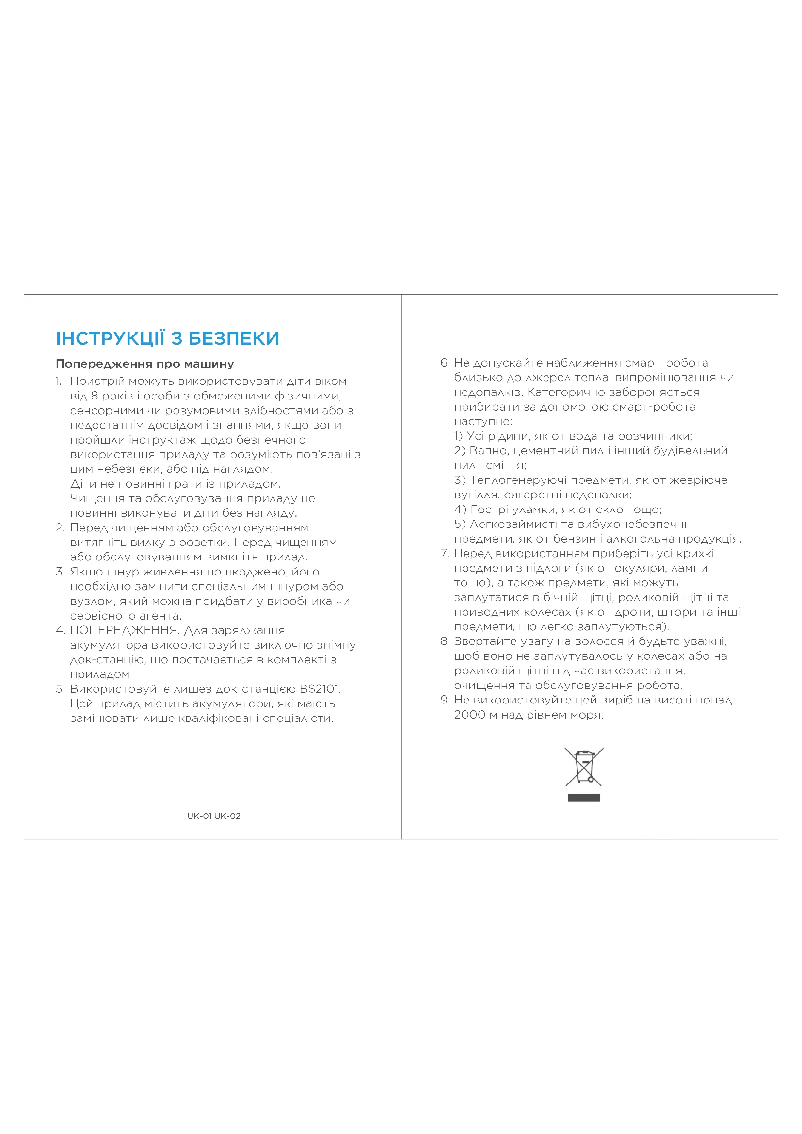 Voir le rappel d'erreur de l'application pour plus de solutions de panne. Défauts description Causes possibles Solutions Défauts description Causes possibles SolutionsUK-01 UK-02 ІНСТРУКЦІЇ З БЕЗПЕКИ Попередження про машину Пристрій можуть використовувати діти віком від 8 років і особи з обмеженими фізичними, сенсорними чи розумовими здібностями або з недостатнім досвідом і знаннями, якщо вони пройшли інструктаж щодо безпечного використання приладу та розуміють пов’язані з цим небезпеки, або під наглядом. Діти не повинні грати із приладом. Чищення та обслуговування приладу не повинні виконувати діти без нагляду. Перед чищенням або обслуговуванням витягніть вилку з розетки. Перед чищенням або обслуговуванням вимкніть прилад. Якщо шнур живлення пошкоджено, його необхідно замінити спеціальним шнуром або вузлом, який можна придбати у виробника чи сервісного агента. ПОПЕРЕДЖЕННЯ. Для заряджання акумулятора використовуйте виключно знімну док-станцію, що постачається в комплекті з