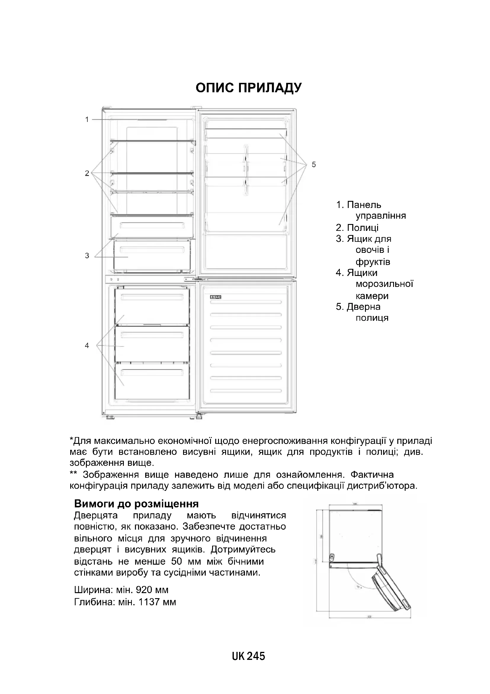 *Для максимально економічної щодо енергоспоживання конфігурації у приладі має бути встановлено висувні ящики, ящик для продуктів і полиці; див. зображення вище. ** Зображення вище наведено лише для ознайомлення. Фактична конфігурація приладу залежить від моделі або специфікації дистриб’ютора.