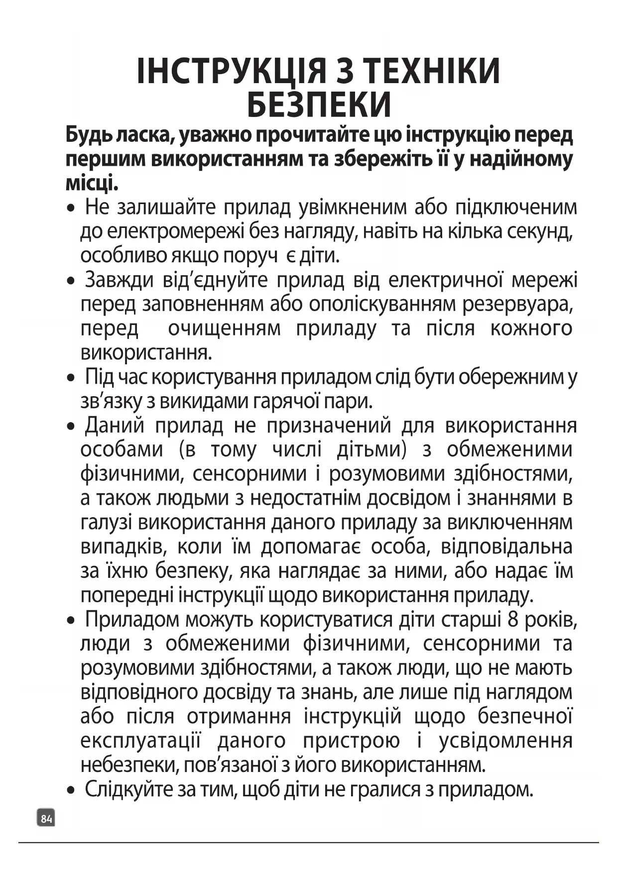- Приладом можуть користуватися діти старші 8 років, люди з обмеженими фізичними, сенсорними та розумовими здібностями, а також люди, що не мають відповідного досвіду та знань, але лише під наглядом або після отримання інструкцій щодо безпечної експлуатації даного пристрою і усвідомлення небезпеки, пов’язаної з його використанням.