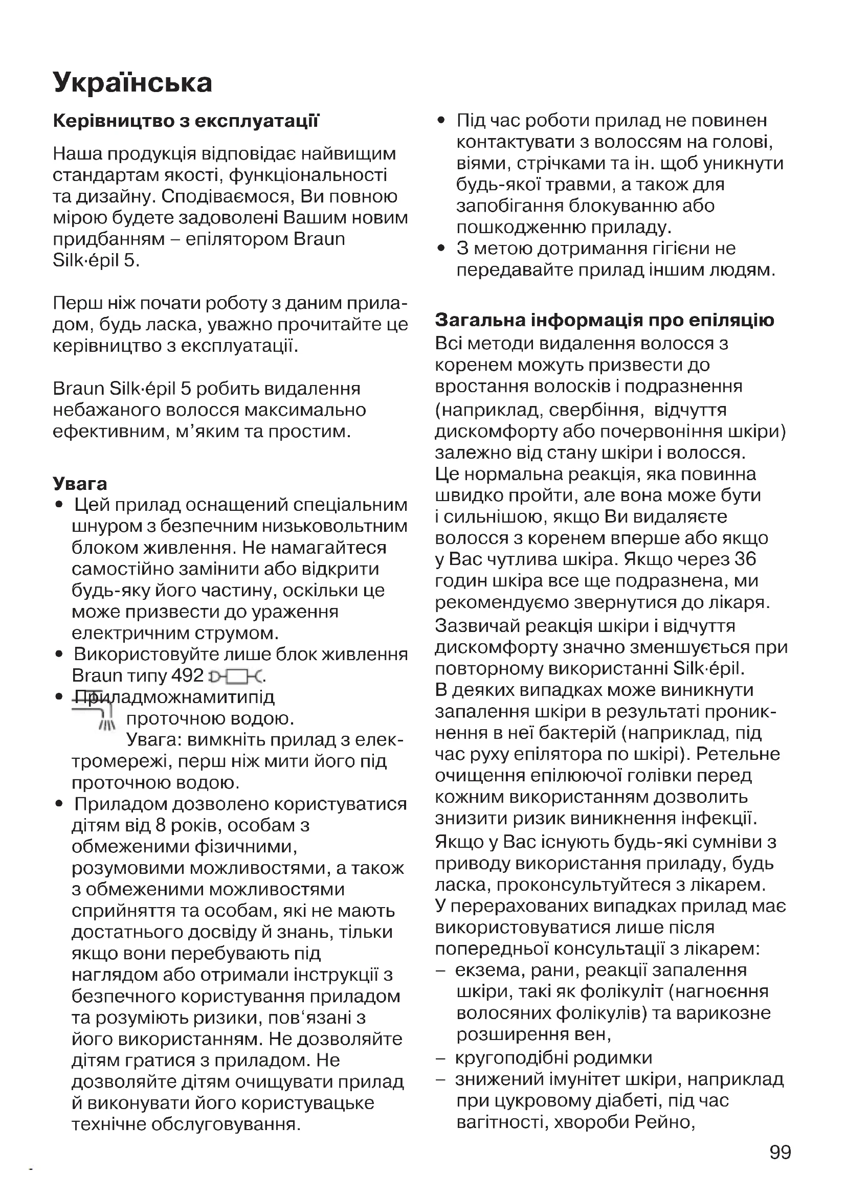 залежно від стану шкіри і волосся. Це нормальна реакція, яка повинна швидко пройти, але вона може бути і сильнішою, якщо Ви видаляєте волосся з коренем вперше або якщо у Вас чутлива шкіра. Якщо через 36 годин шкіра все ще подразнена, ми рекомендуємо звернутися до лікаря. Зазвичай реакція шкіри і відчуття дискомфорту значно зменшується при повторному використанні Silk·épil. В деяких випадках може виникнути запалення шкіри в результаті проник- нення в неї бактерій (наприклад, під час руху епілятора по шкірі). Ретельне очищення епілюючої голівки перед кожним використанням дозволить знизити ризик виникнення інфекції. Якщо у Вас існують будь-які сумніви з приводу використання приладу, будь ласка, проконсультуйтеся з лікарем. У перерахованих випадках прилад має використовуватися лише після попередньої консультації з лікарем: – екзема, рани, реакції запалення шкіри, такі як фолікуліт (нагноєння волосяних фолікулів) та варикозне розширення вен, – кругоподібні родимки – знижений імунітет шкіри, наприклад при цукровому діабеті, під час вагітності, хвороби Рейно,