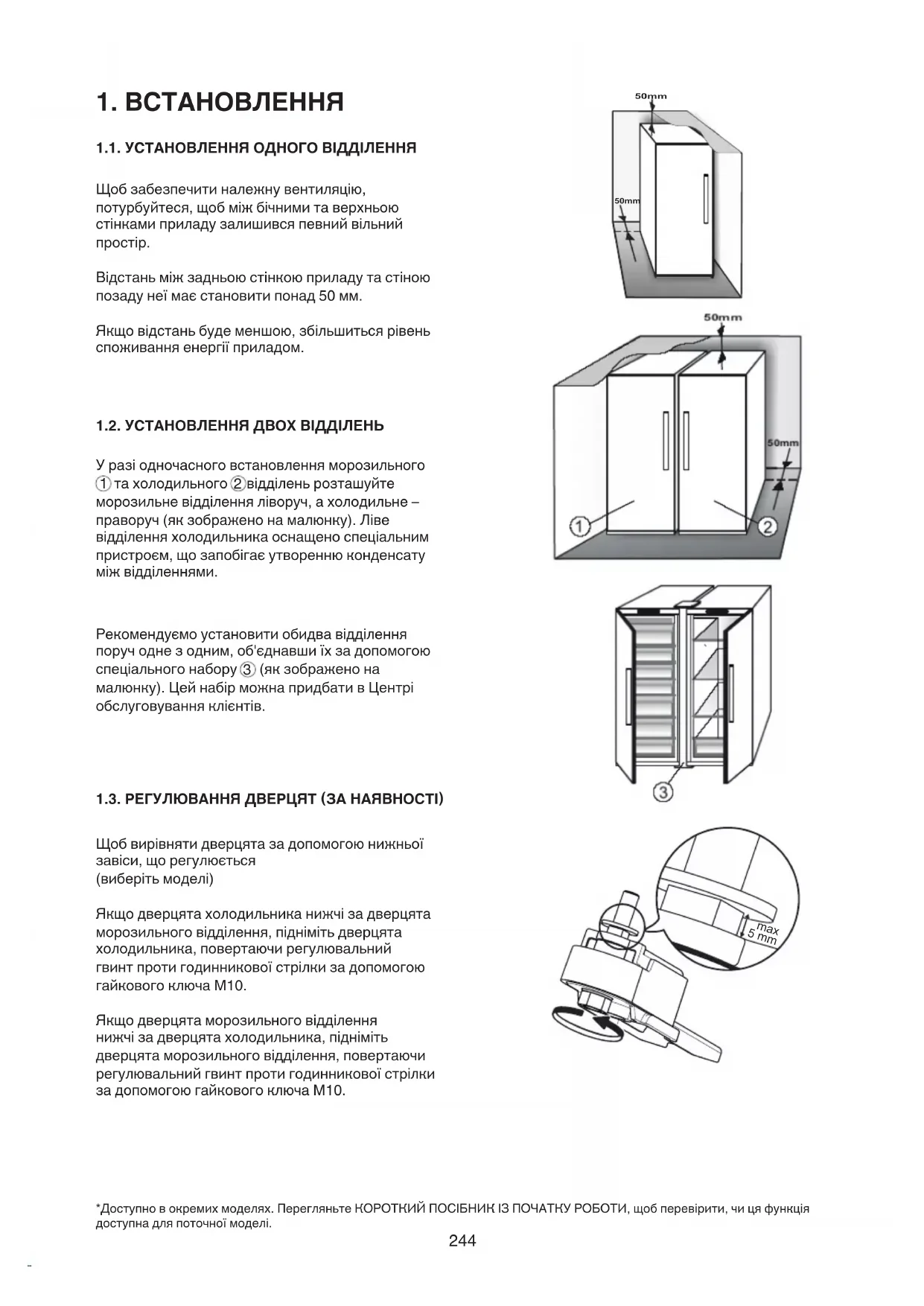 Відстаньміжзадньоюстінкоюприладутастіною позадунеїмаєстановитипонад50мм. Якщовідстаньбудеменшою,збільшитьсярівень споживанняенергіїприладом. 1.2. УСТАНОВЛЕННЯ ДВОХ ВІДДІЛЕНЬ Уразіодночасноговстановленняморозильного