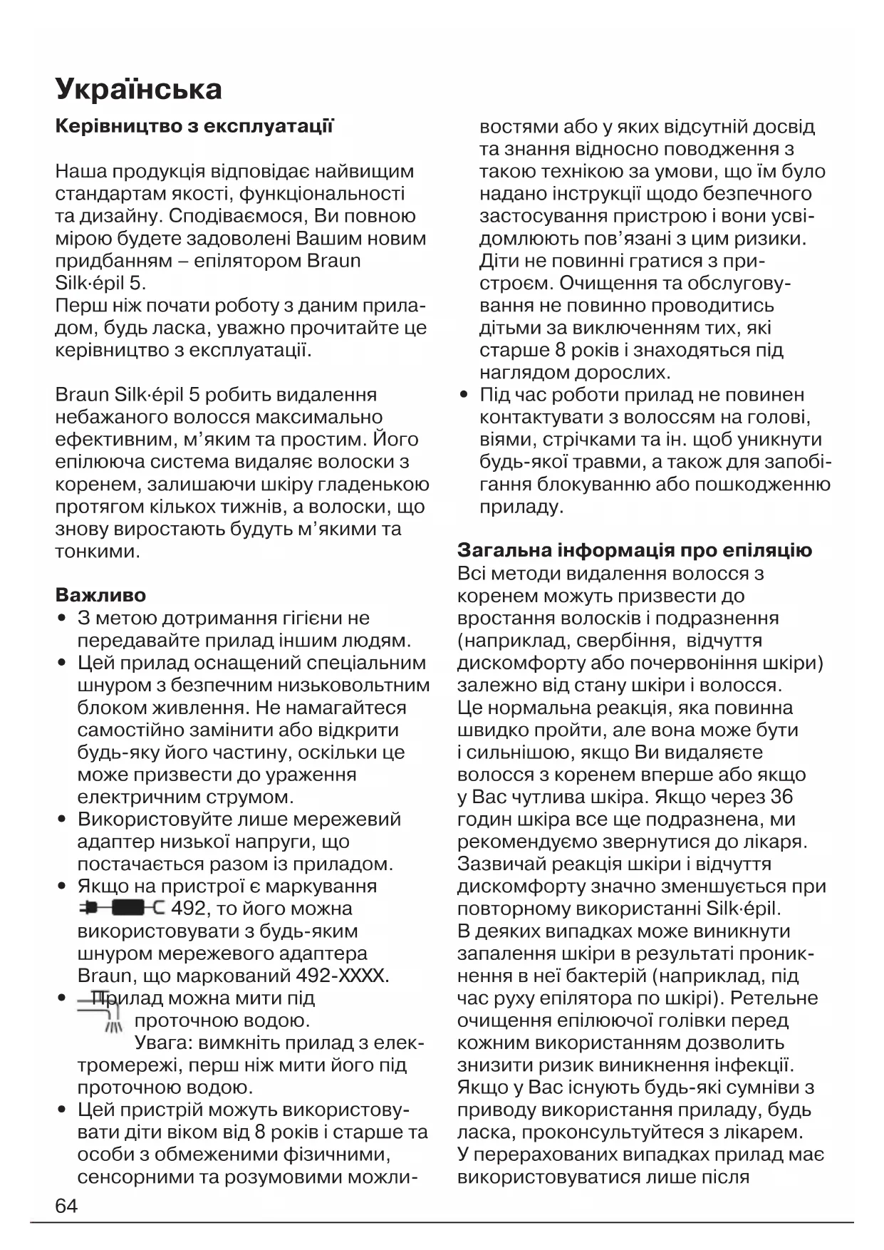 Комплектація приладу може змінюватися виробником без попереднього повідомлення. Електричний епілятор Braun типу 5340 із джерелом живлення типу 492-XXXX. Якщо виріб (корпус) промарковано цифрами 492, то його можна використовувати з будь-яким джерелом живлення Braun, промаркованим кодом 492-ХХХХ. Символи «Х» в коді замінюють цифру від 0 до 9 і означають різні модифікації джерел живлення, що мають ідентичні технічні характеристики та відрізняються одне від одного лише кольором або формою. Завжди використовуйте лише набір шнурів, що постачається у комплекті із вашим