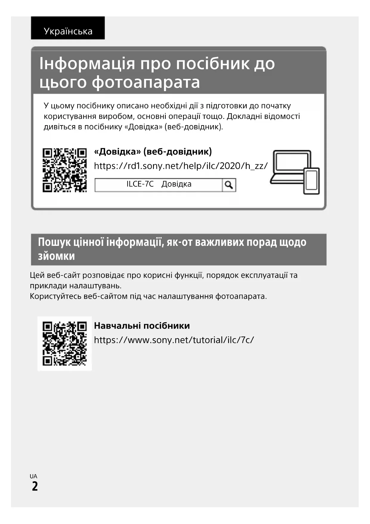 Інформація про посібник до цього фотоапарата У цьому посібнику описано необхідні дії з підготовки до початку користування виробом, основні операції тощо. Докладні відомості дивіться в посібнику «Довідка» (веб-довідник). https://rd1.sony.net/help/ilc/2020/h_zz/ «Довідка» (веб-довідник) ILCE-7C Довідка Пошук цінної інформації, як-от важливих порад щодо